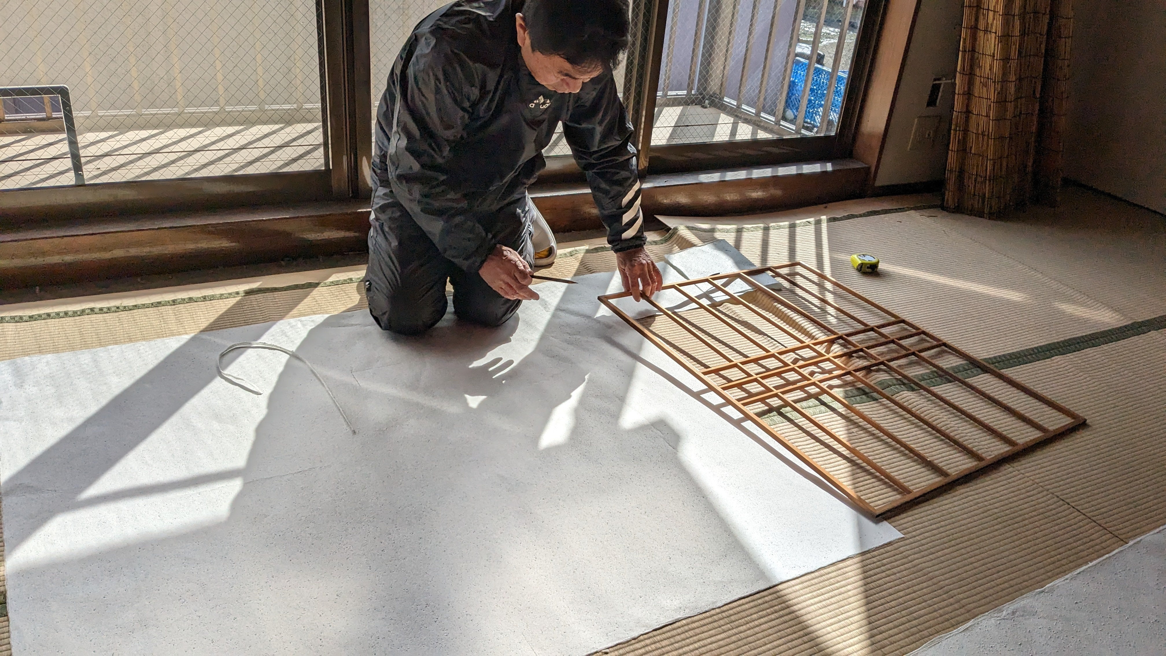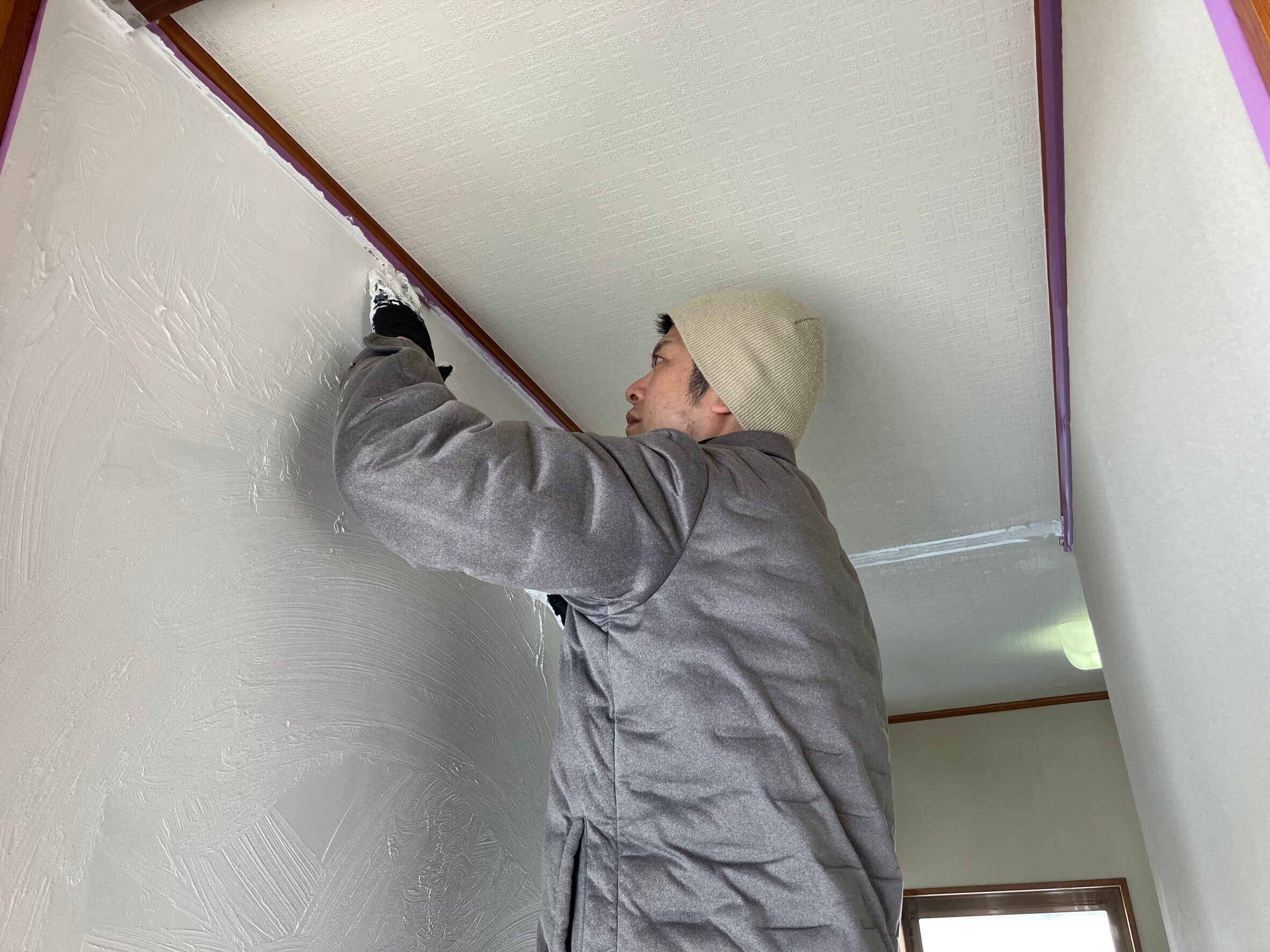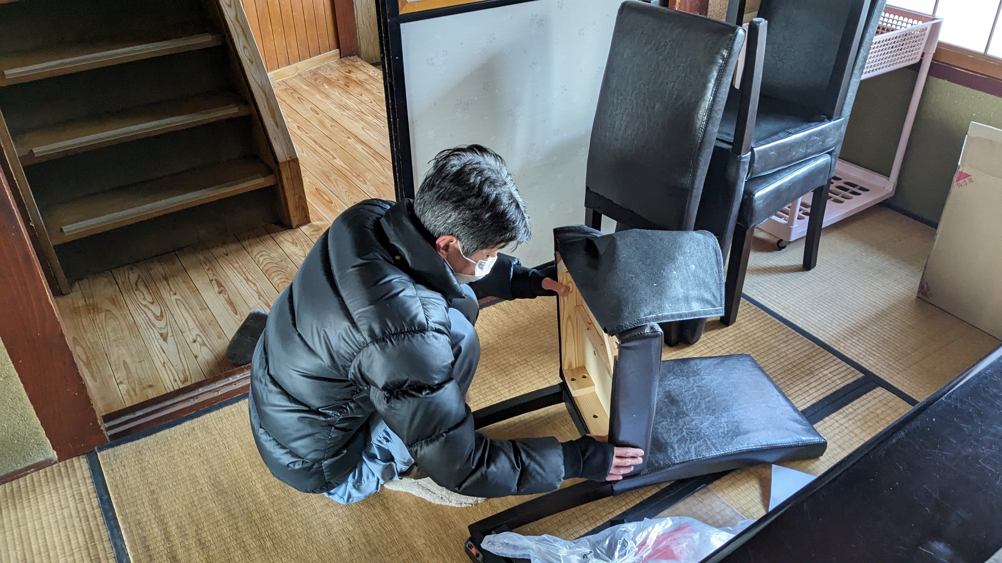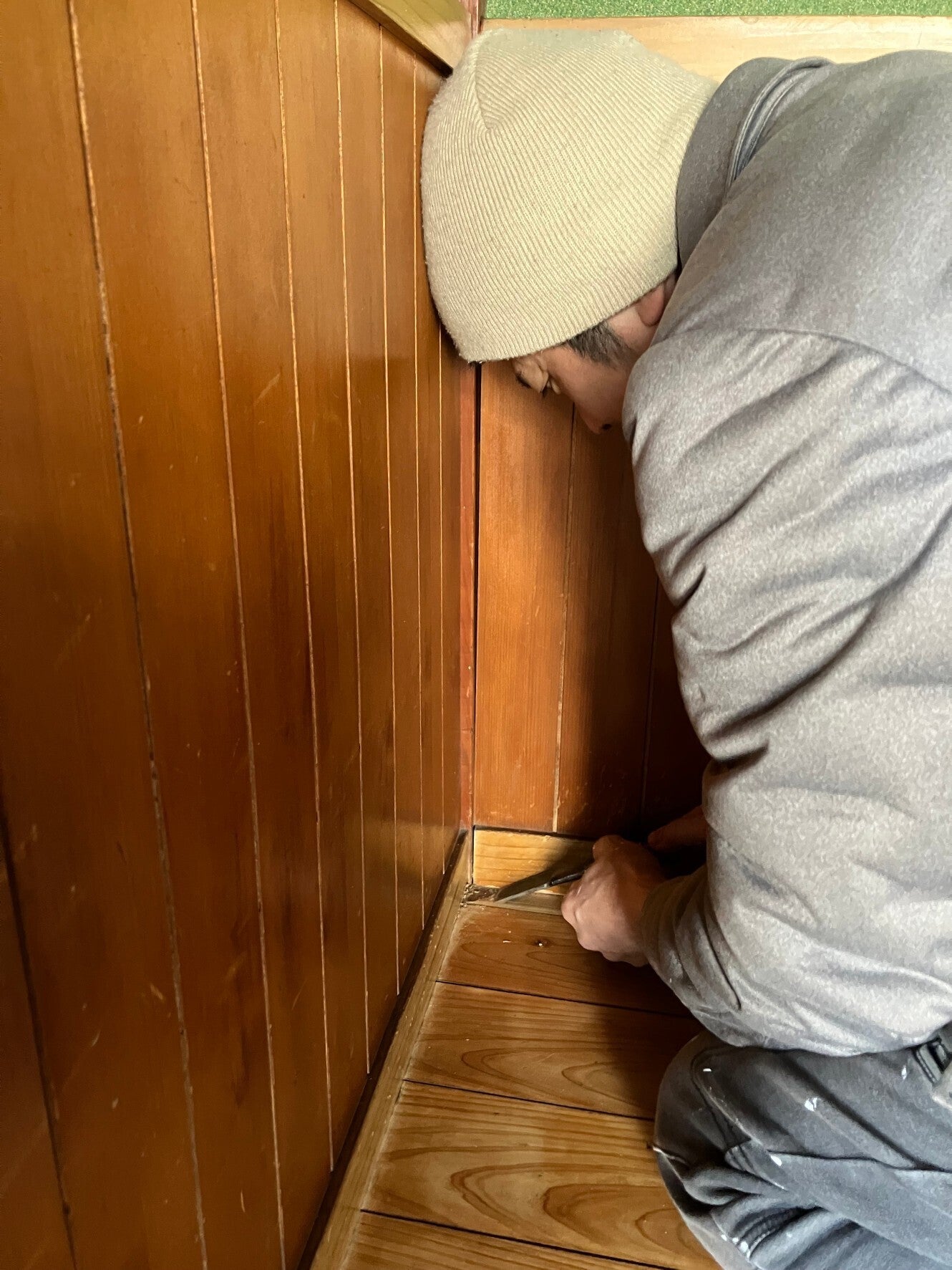 無垢床の角はノミで削ってウレタン塗装を剥がします
