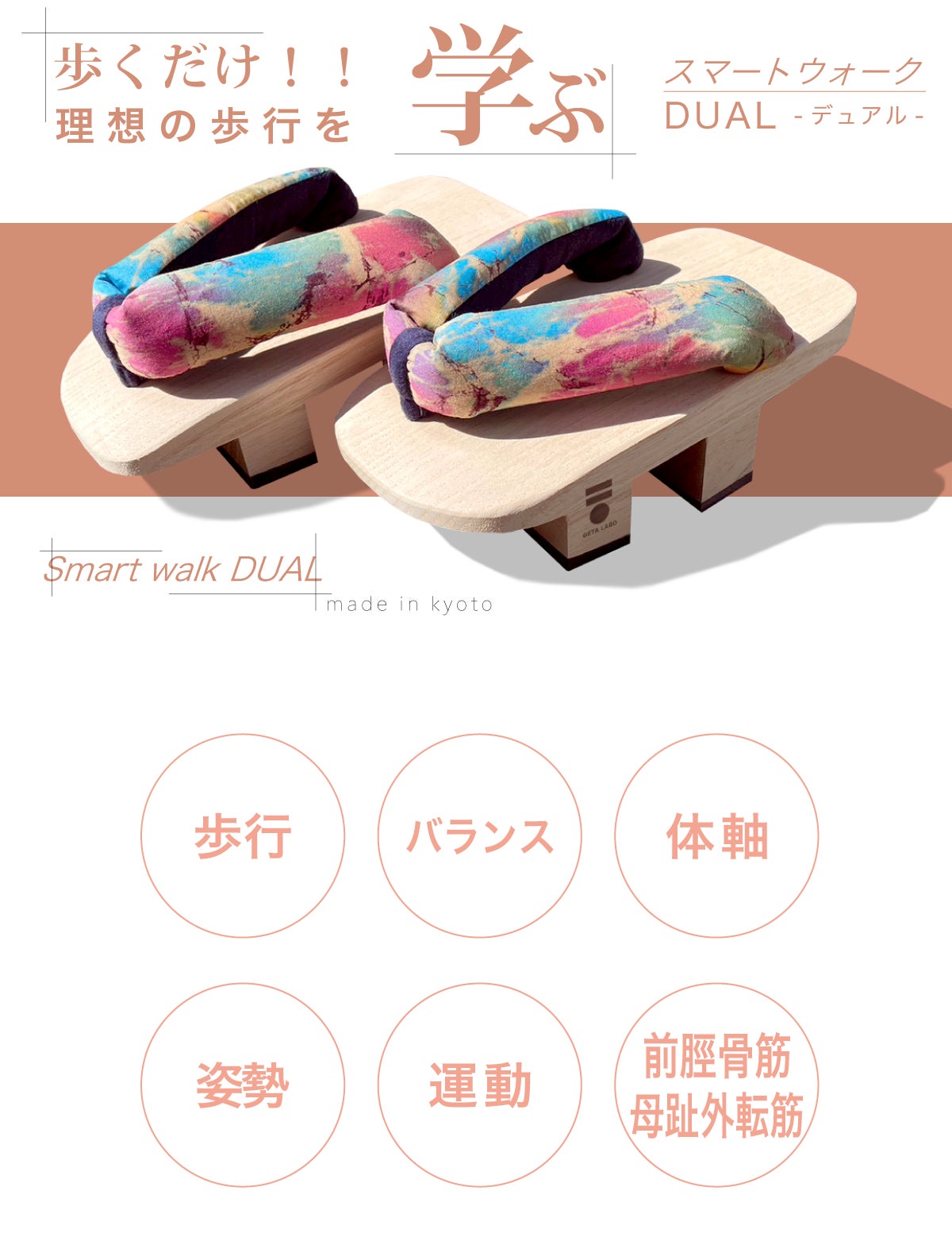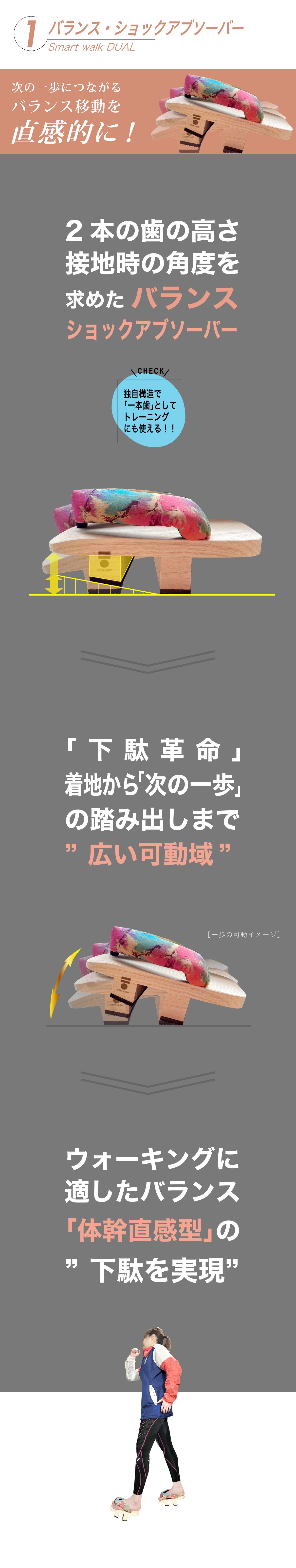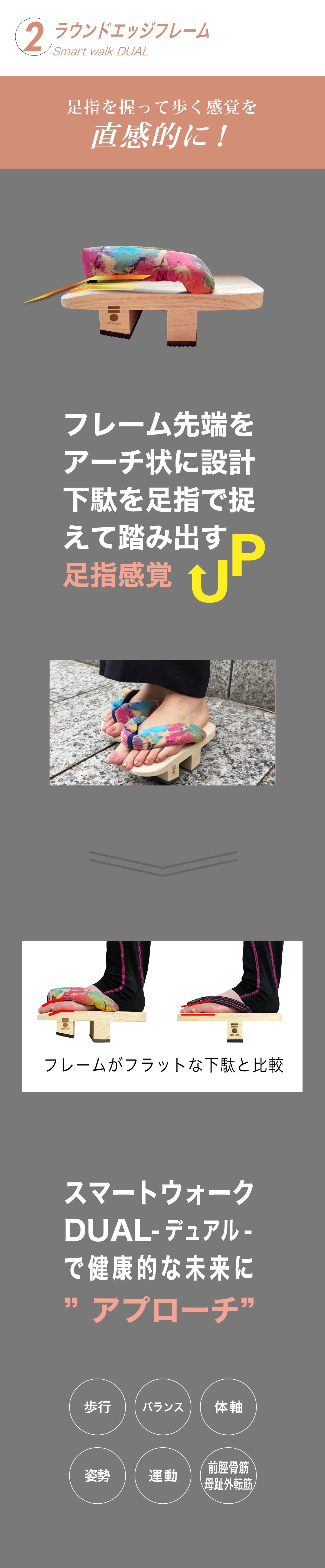 そんなGETA LABOから、下駄でのトレーニングが初めての方でもウォーキングなどに気軽にチャレンジいただける下駄として開発した2本歯下駄「スマートウォークDUAL-デュアル-」のご提案です。