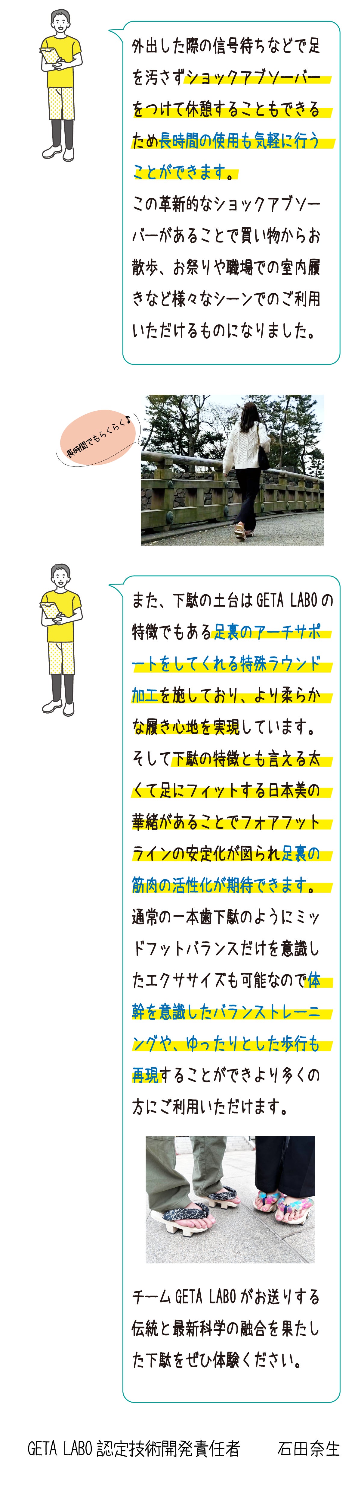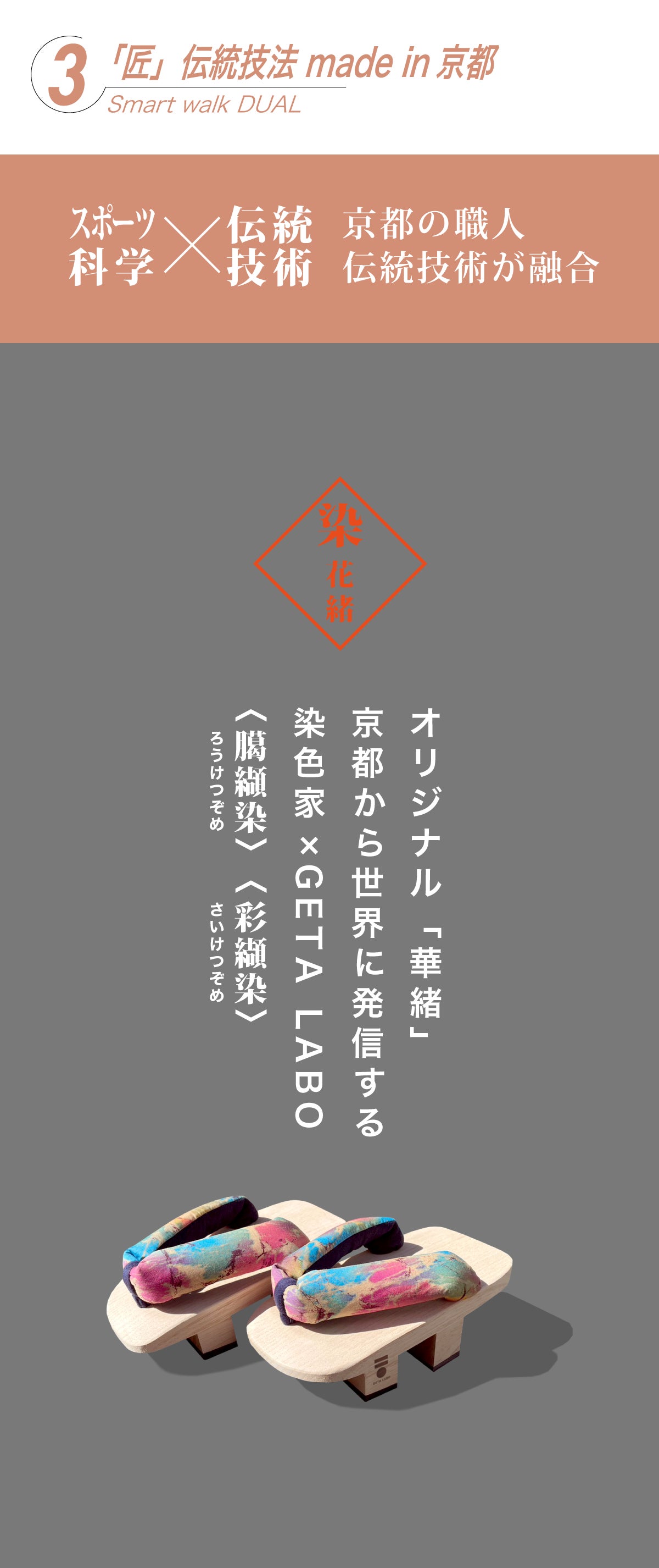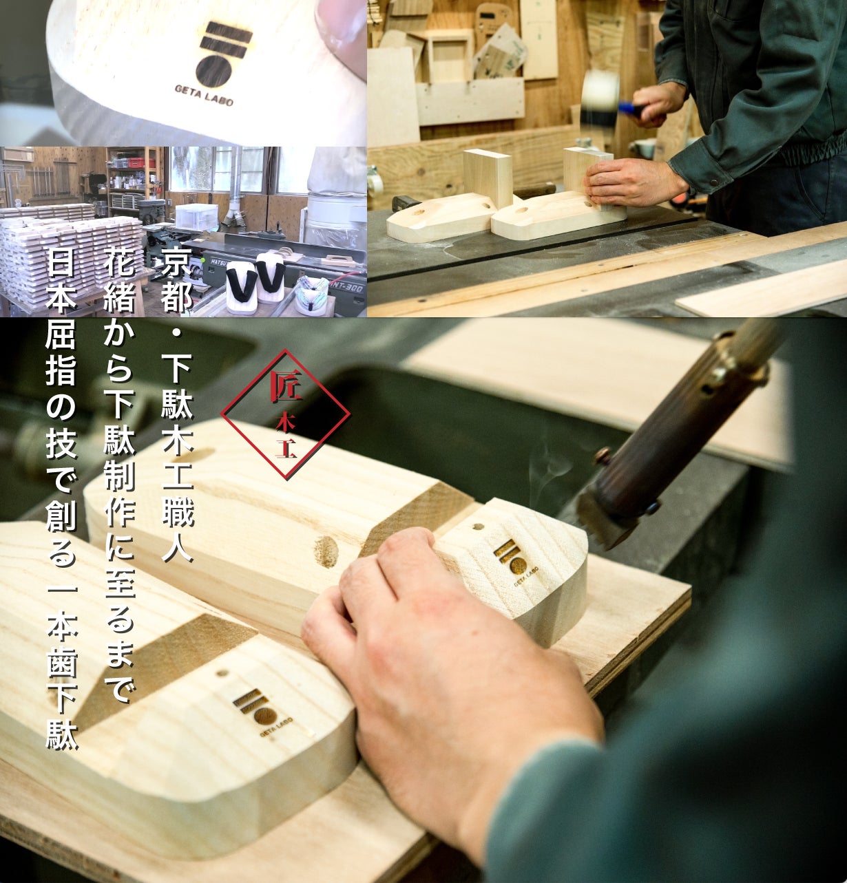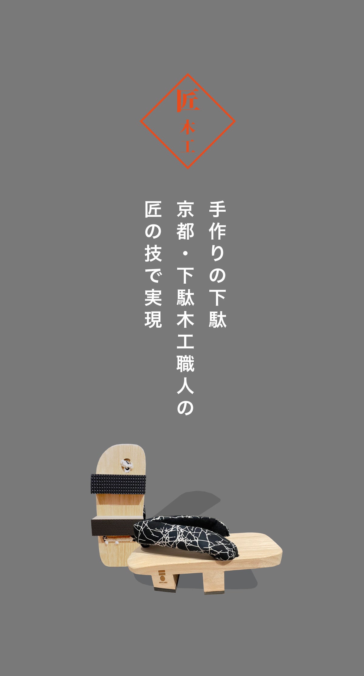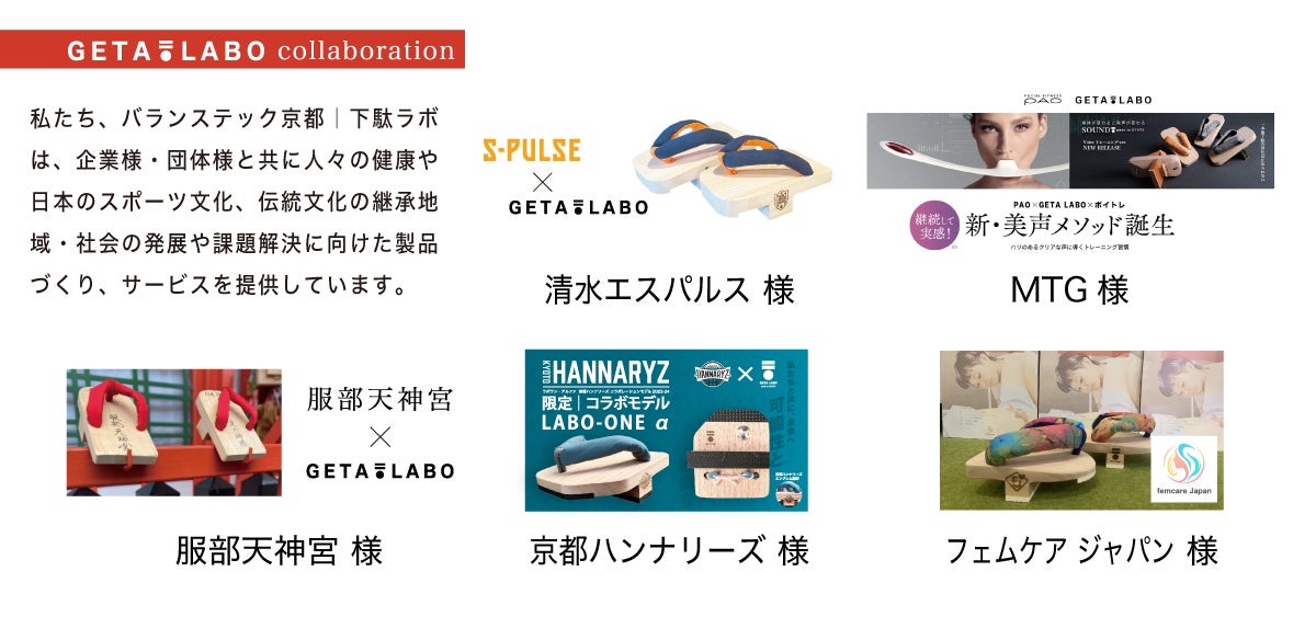 「GETA LABO」ブランドでは、秘められた身体能力・可能性をサポートする「一本歯下駄」と「GETA LABO専用トレーニングメソッド」の開発・販売を行い、バランス下駄の設計に「スポーツ科学」を取り入れ、京都を中心に全国の様々な職人のもと「匠の技法を用いた伝統あるものづくり」を融合することで、新しい一本歯下駄でありながら日本古来の伝統的な美しさをもつスポーツ「一本歯下駄」として、現代に新たな価値を創造し継承しています。