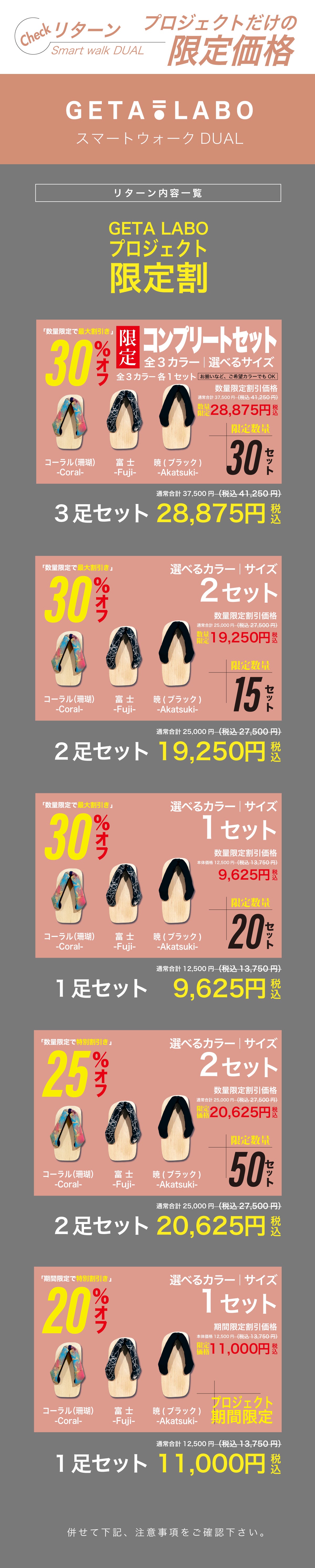 2024/04/10 11:42皆様お世話になっております。GETA LABO 事務局です。2月より開始いたしましたSmart Walk DUAL -スマートウォーク デュアル-昨日をもちまして、無事にプロジェクト終了いたしました。合計81名、総額116万円を超えるご支援を頂くことが出来ました。ご支援ならびに応援いただきました皆様に、この場をお借りして心より感謝申し上げます。誠にありがとうございます。本プロジェクトを通して頂きました支援金につきましては、今後の研究開発をはじめ、商品・サービスの質向上などにおける活動費に充てる予定です。商品につきましては順次発送を進めてまいります。お届けまでにしばらくお時間を頂き恐縮ですが、何卒お待ちいただけますと幸甚です。また、今後はGETA LABO の公式オンラインストアにてお買い求めいただけます。https://getalabo-store.com/items/65bcaf998ea9bd2aa32aff58今回様々なご事情により期間内にご支援が叶わなかった方におかれましたは、ぜひこちらからよろしくお願いいたします。その他ご不明な点やご要望がございましたら、いつでもお気軽にお問い合わせくださいませ。今後ともGETA LABO への変わらぬご愛顧のほど、何卒よろしくお願い申し上げます。 もっと見る