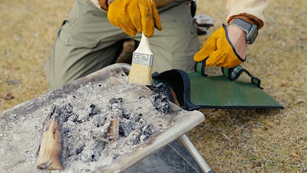 トングでは掴みづらい、細かいカスや灰は「焚き火ブラシ」で一発解消。