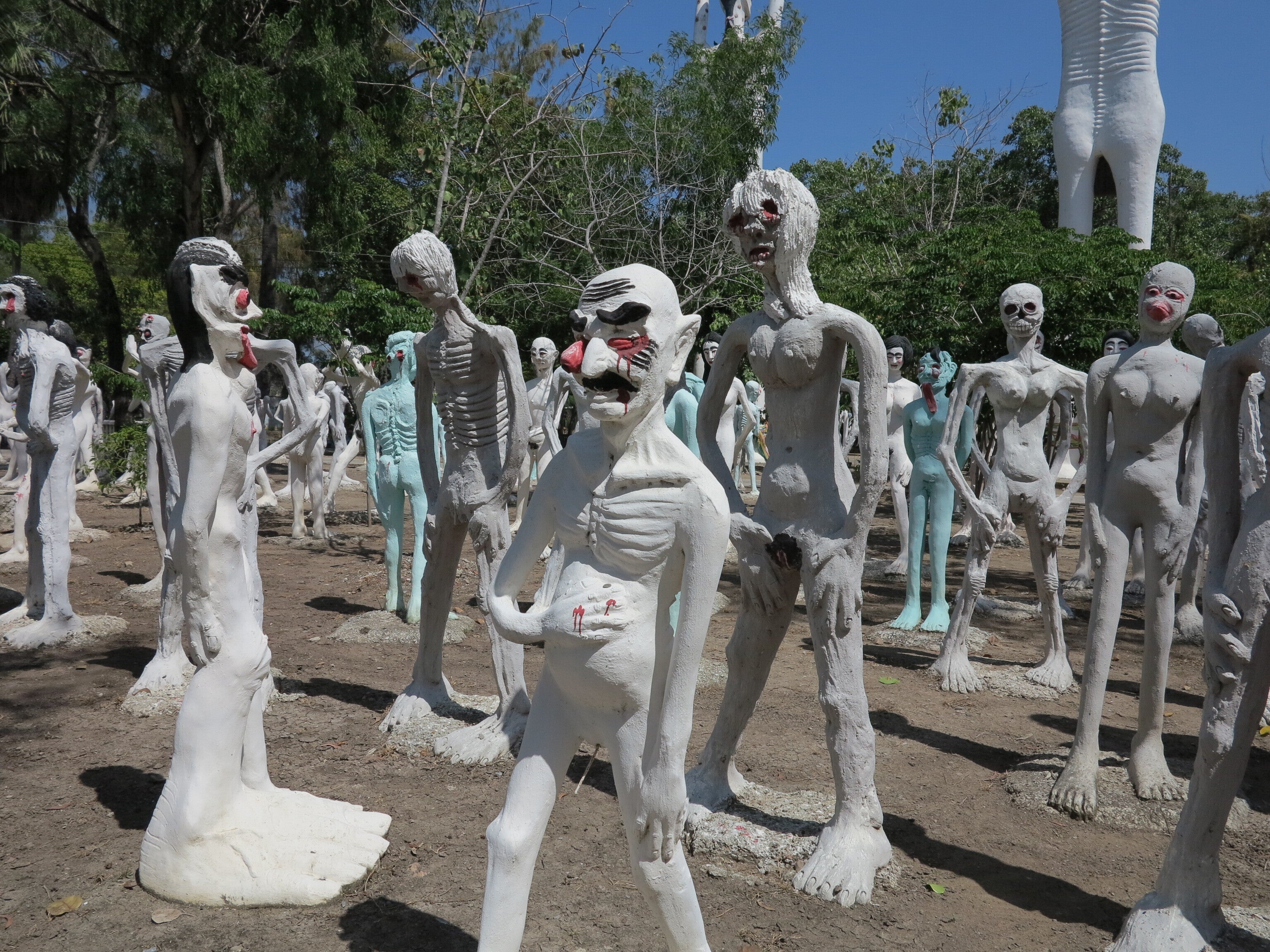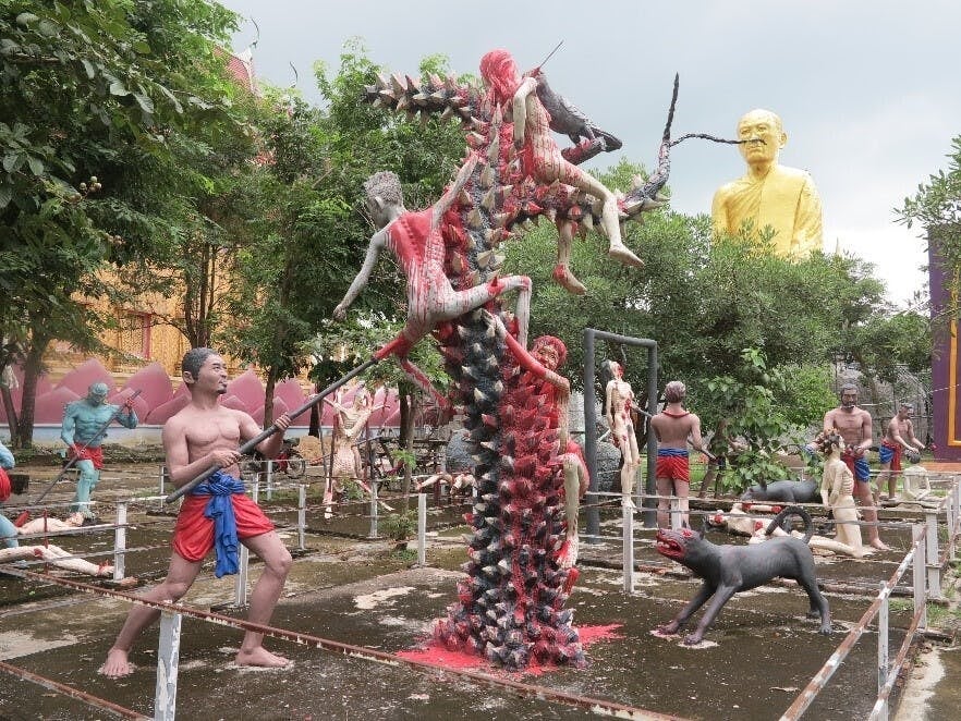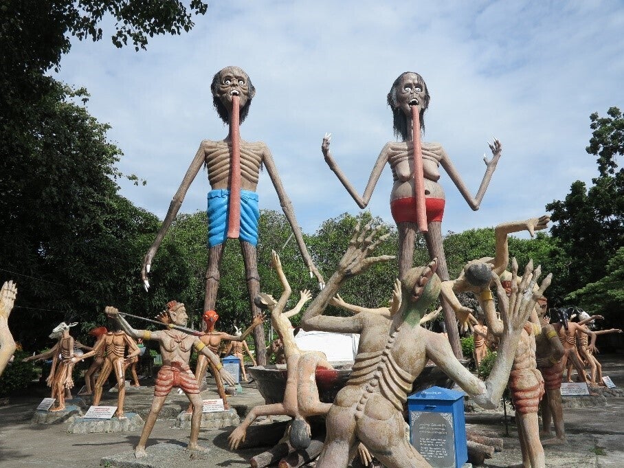 現在、タイには約3万の寺院があるといわれていますが、そのなかにキッチュでグロテスクな立体像をつくって地獄をあらわしている寺院が存在します。これがいわゆる「地獄寺」です。