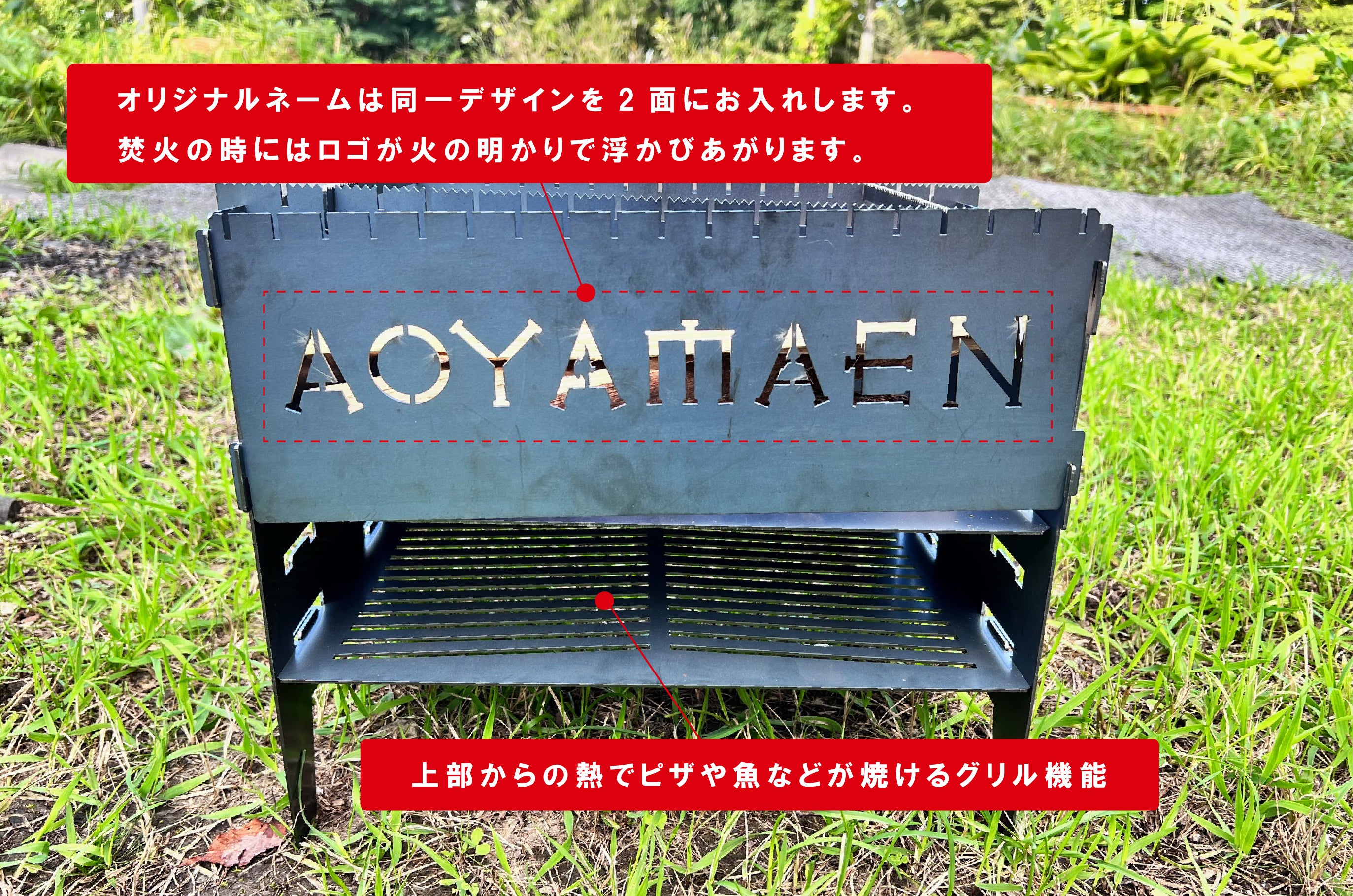 1台で焚火台はもちろん焼き台として下段には上部の熱で料理が出来るグリル機能