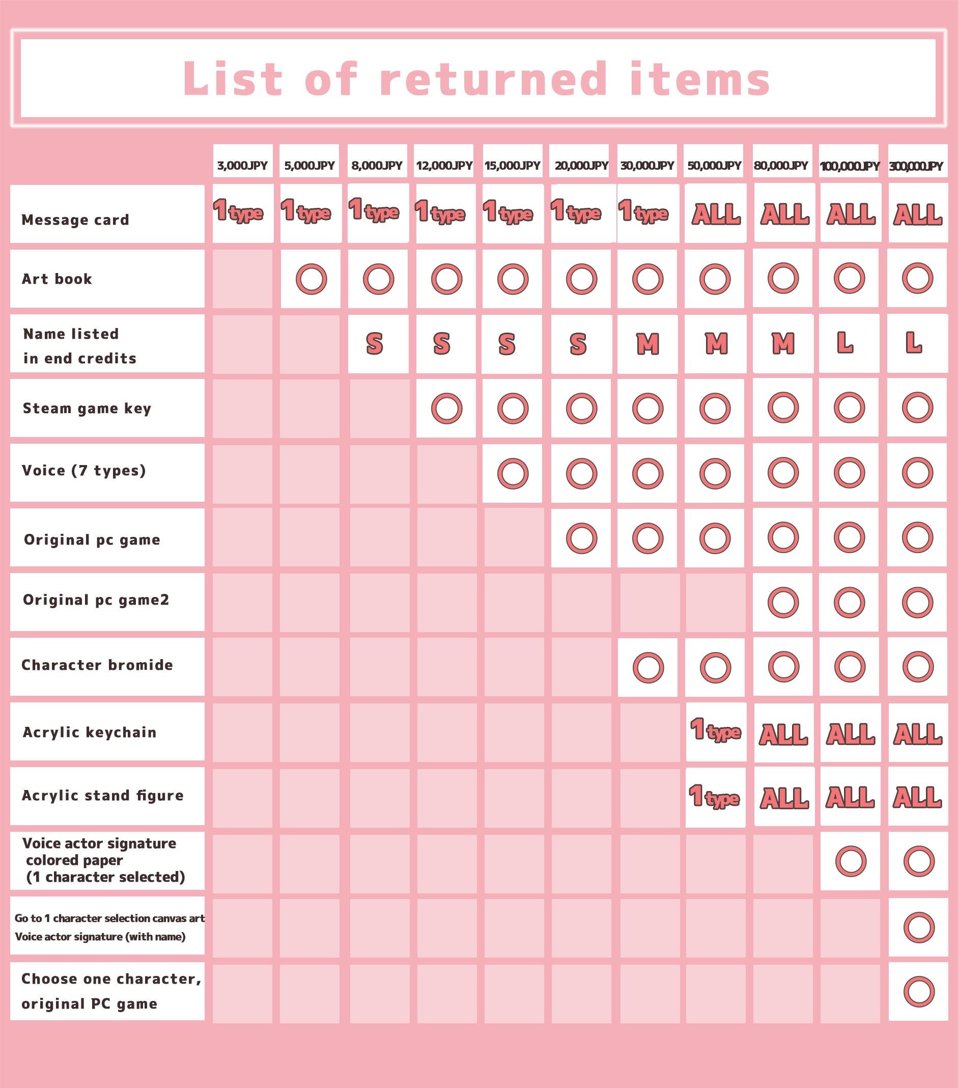 下記リターン品、サービス各種一覧と早見表、及び各支援コースをご確認ください。