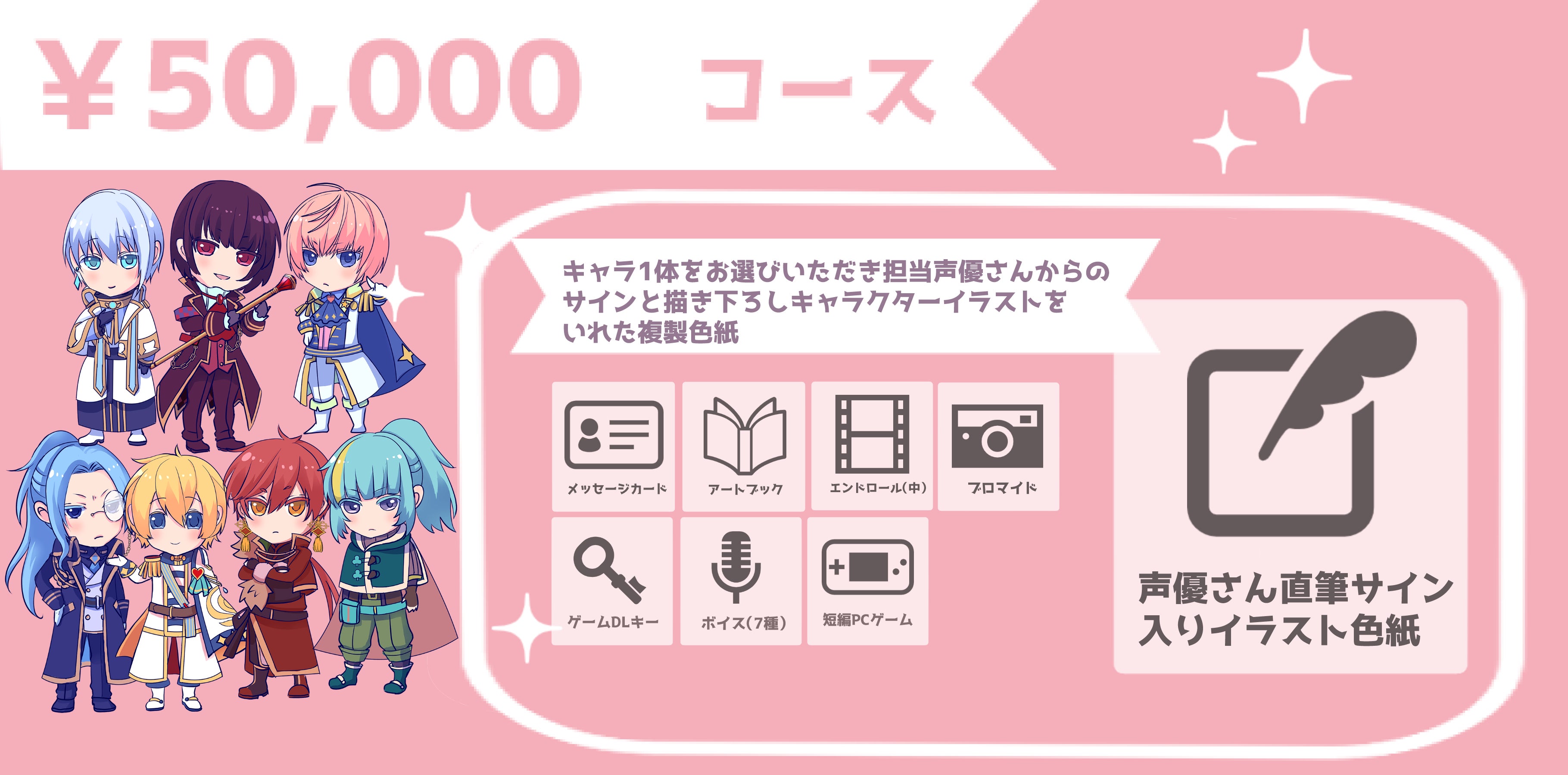 ・选择一个角色,即可获得一张带有负责配音演员先生/女士亲笔签名的彩色纸和一张新绘制的角色插图、命名一个角色的新绘制的角色插图和由负责配音演员签名的画布艺术!