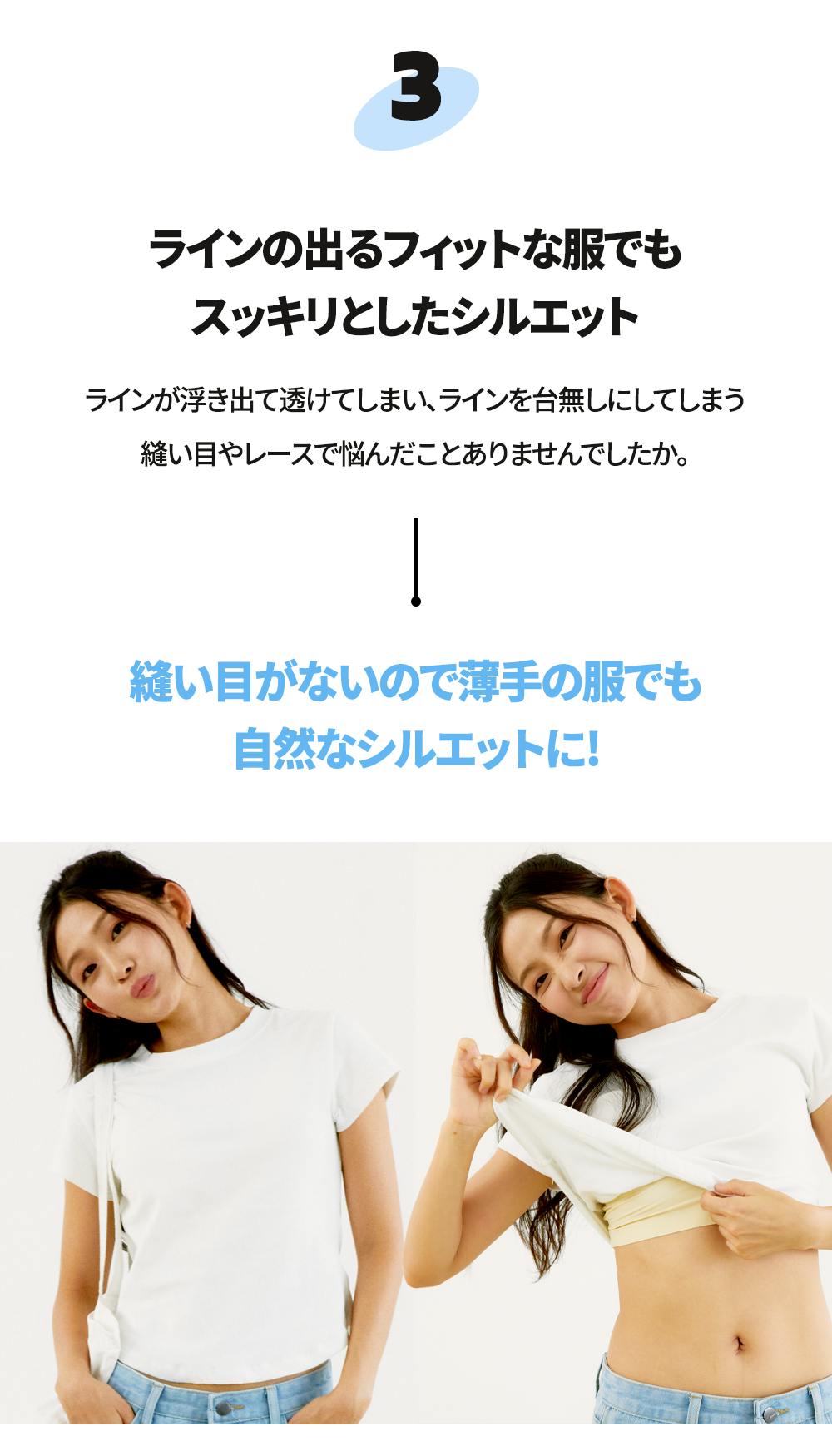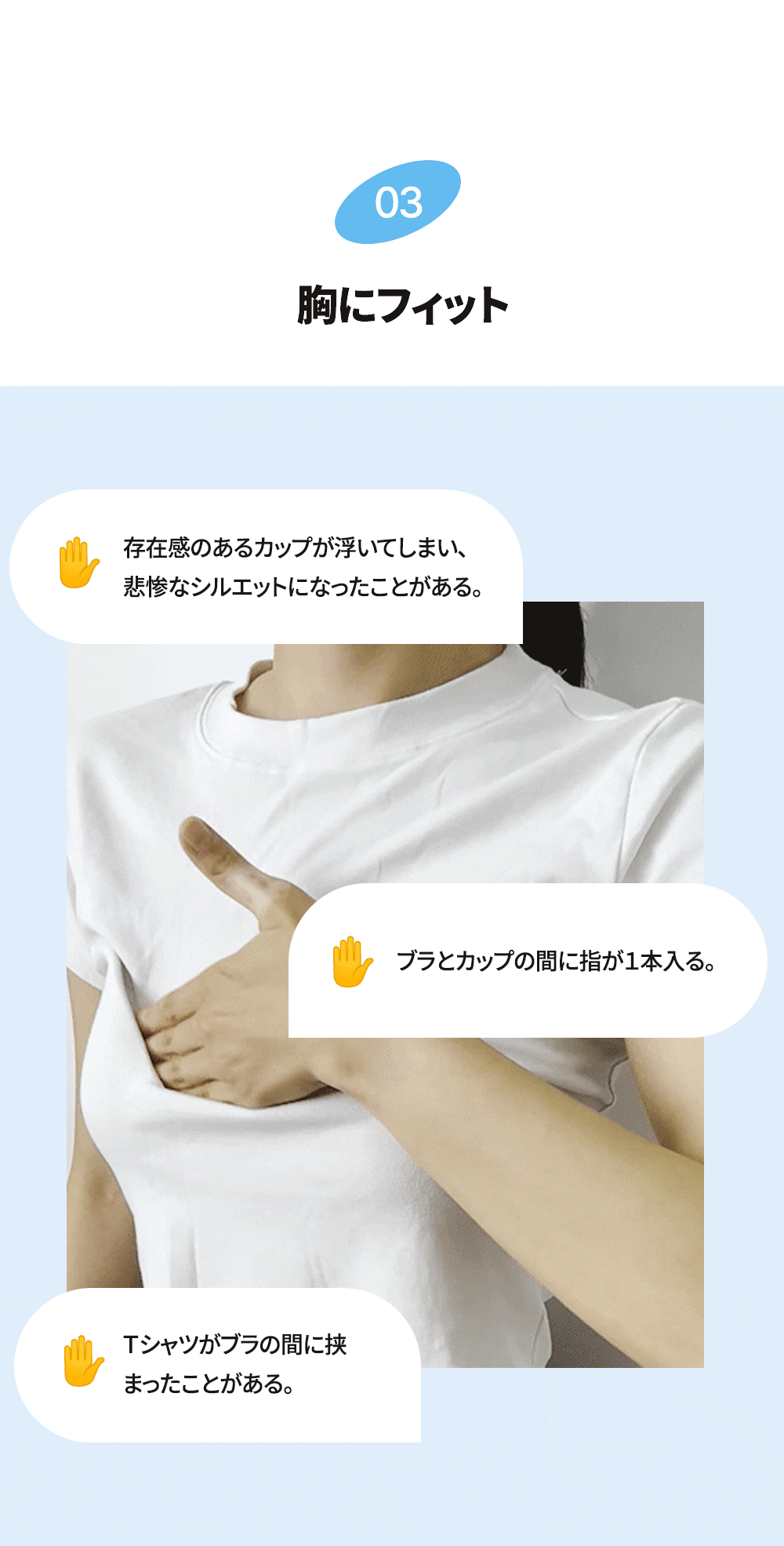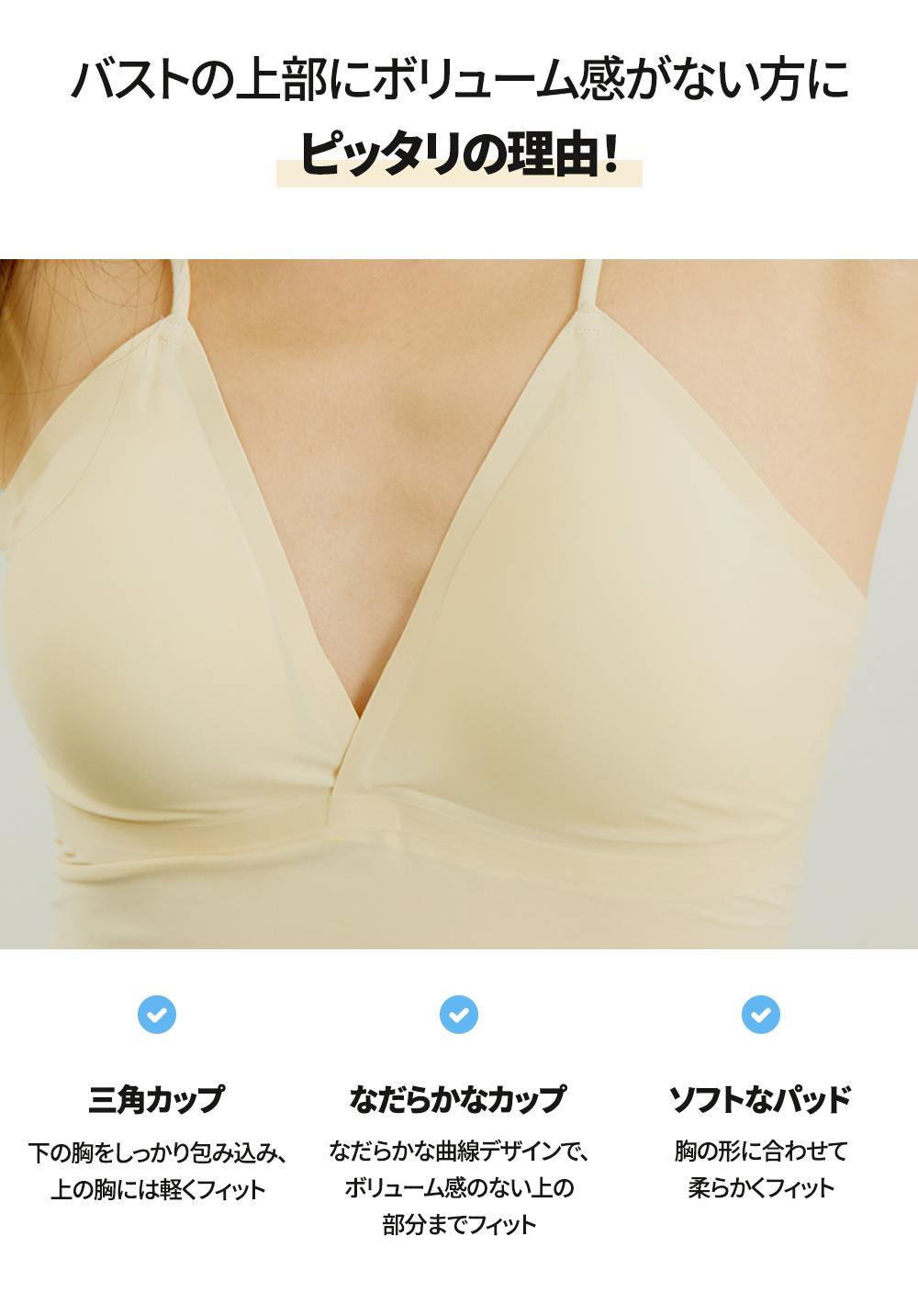 A:この製品は肌に軽く密着し、本来のシルエットを最も自然に生かしてくれる製品で、まるで着ていないような究極の快適さを経験したい方におすすめしています。どうしてもブラジャーから圧迫感を与える要素を除去した製品なので、胸を上げたり集めたりするなどのドラマチックな効果を望むならおすすめしません。