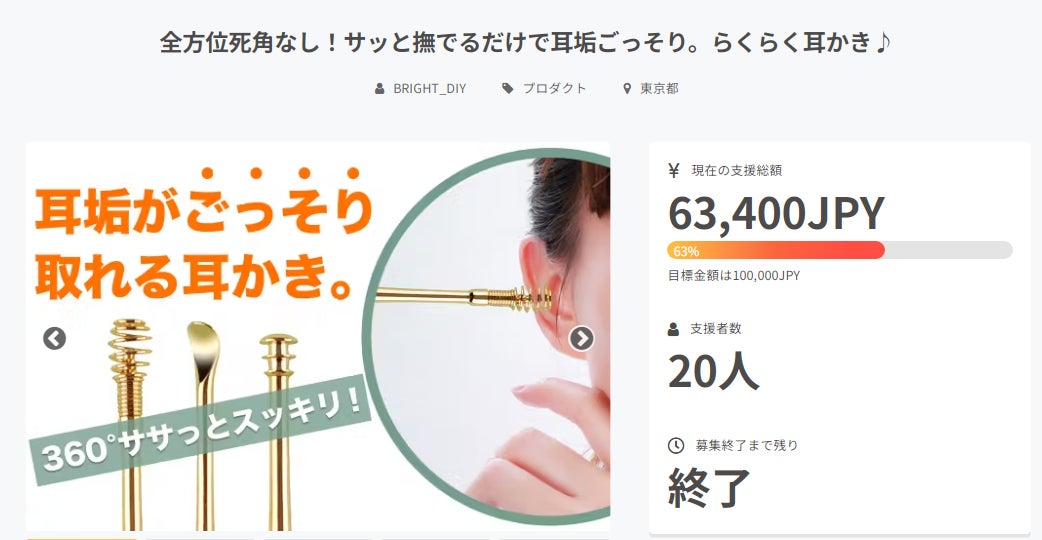 • ご支援者、Brightチームです。お世話になっております。プロジェクト開始から43日目で20人ものご支援者の方々より支援頂き、無事プロジェクト終了を迎えることが出来ました。早速皆様のリターンを2024年04月末にお届けできるよう準備を始めております!皆様にご満足いただけるリターンをお届けできるよう、全力で取り組んで参りますので引き続き、「EAR WAX 」をよろしくお願い致します。BRIGHTチーム もっと見る