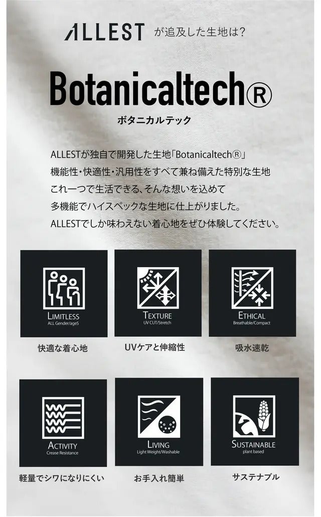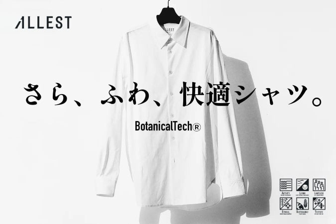 サステナブルブランドALLESTの開発しています。Botanicaltech®スーツはご好評をいただき、この度「シャツ」を開発公開致します。SSスーツの「さらっ」「ざらっ」「とろっ」の手触りをより「さらり」とさせた着心地のいい「シャツ」です。どうぞ、よろしくお願いいたします。