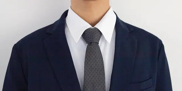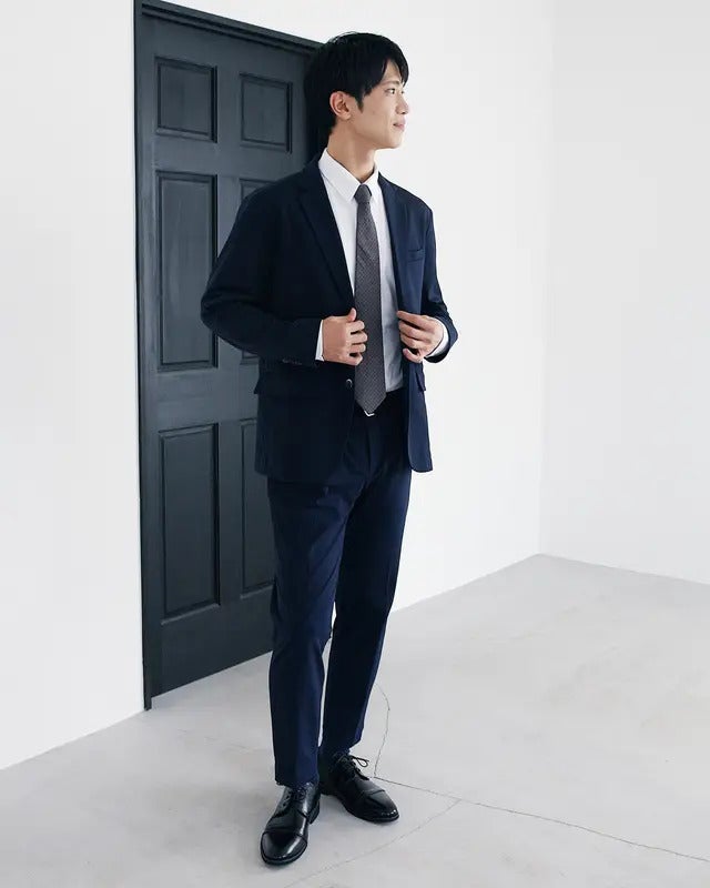 ネクタイでも、ノータイでも決まるパターン。ALLESTサステナブルオールインワンスーツとの相性も抜群です。