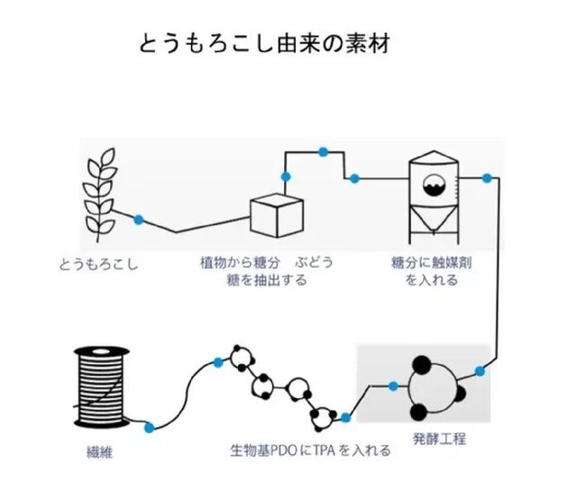 「BotanicalTechⓇ」の主原料PTT(ポリトリメチレンテレフタレート)はテレフタル酸+1.3P・D(プロパンジオール)を結合しでんぷんからグリセリンを経て製造されます。この1.3PDプロパンジオールがとうもろこし由来です。