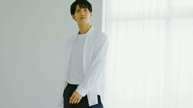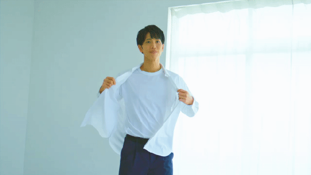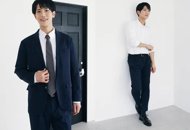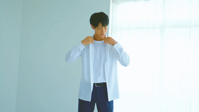 【印象演出が多彩】ボタンを一番上まで止めると「真面目」「好印象」。開けて着ると「リラックス」「アクティブ」に。