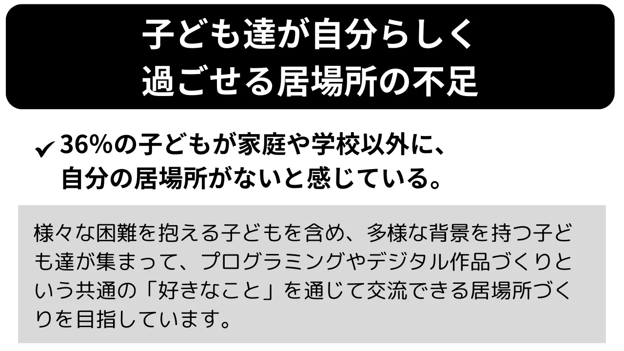 いま、私たちの周りには、経済的な事情や、教育への保護者の関心・意欲など、生まれ育った家庭環境によって、「学びたいことが、学べない」子ども達が沢山います。学ぶことは生きる希望につながる本当に大切なものだから、環境に関わらず、子ども達が好きなことを好きなだけ学べるような社会にしたい。そんな思いで私たちは、プログラミングを無料で教えるボランティア活動を2016年にスタートしました。プログラミングを学ぶことで、子ども達が「困難の中にあっても前に進む力」「自ら学び続ける力」を早い時期から身につけ、自分の人生を自分で切り拓いていくきっかけにしたいと考えています。