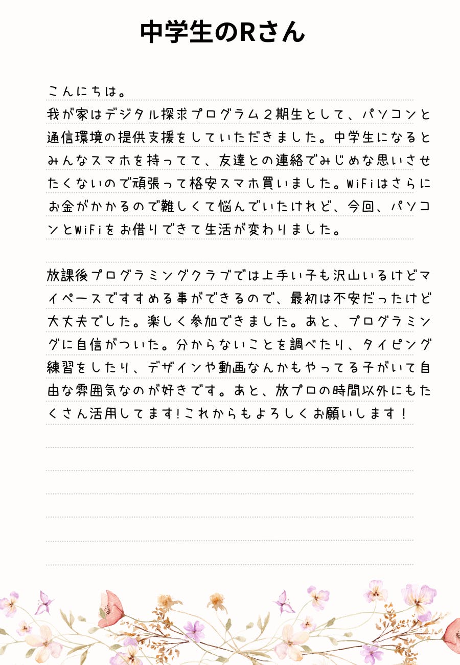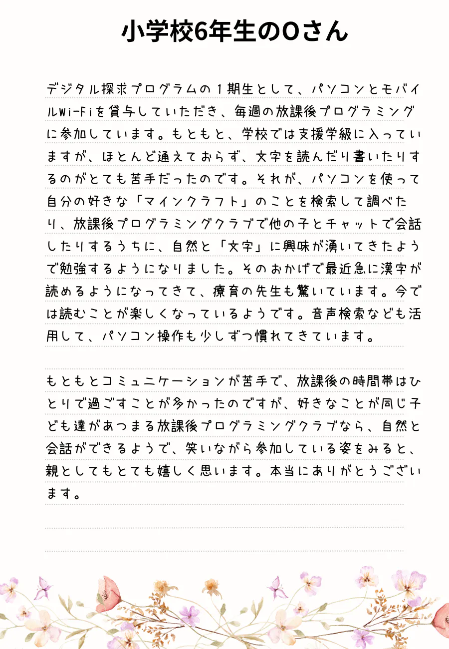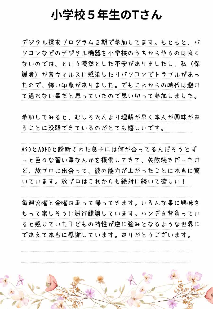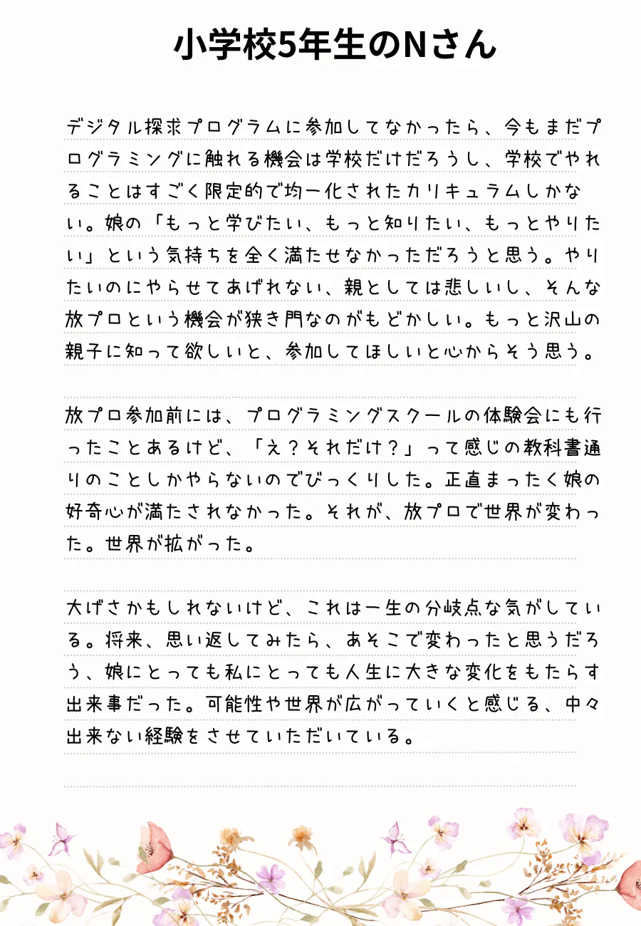 作品を通して親子の会話が増えたり、そういった子どもの変化から、保護者の方から「自分もプログラミングを学んでみたい」という意欲も引き出すことにも繋がっています。そんな子ども達や保護者さんから届いたメッセージの一部をご紹介いたします。