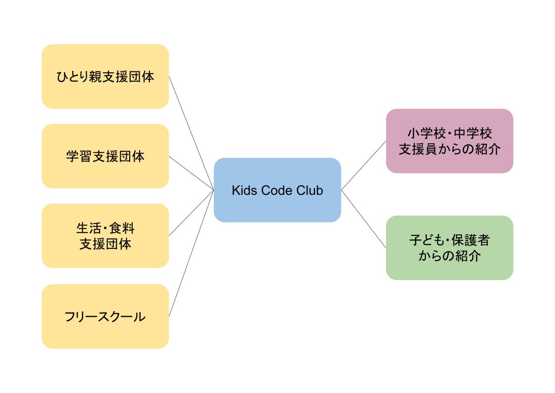 Kids Code Clubには、貧困、ひとり親、不登校、発達障害、海外にルーツをもつなど、多様な子どもたちが参加していますが、困難を抱える子どもだけに限定して機会を提供するのではなく、あらゆる子どもたちがともに学べる、インクルーシブな環境づくりを重視しています。