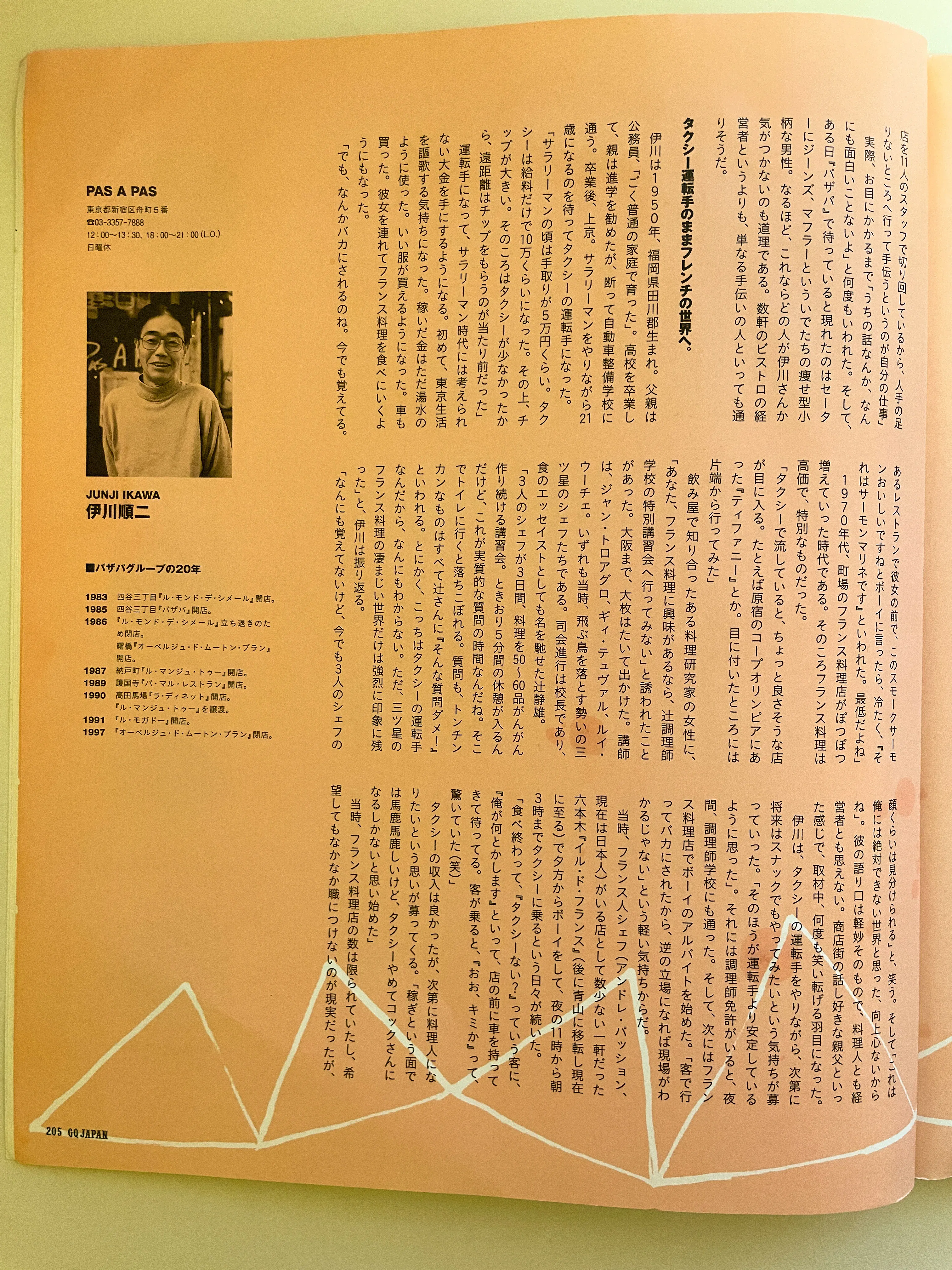 全盛期の1990〜2000年頃は都内7店舗まで拡大して店舗展開していました。(パザパ/四谷三丁目、オーベルジュ・ド・ムートン・ブラン/曙橋、ル・マンジェ・トゥー /納戸町、ラ・ディネット/高田馬場、パ・マル・レストラン/護国寺、ル・モガドー/目白台、メトロ/新宿御苑前)