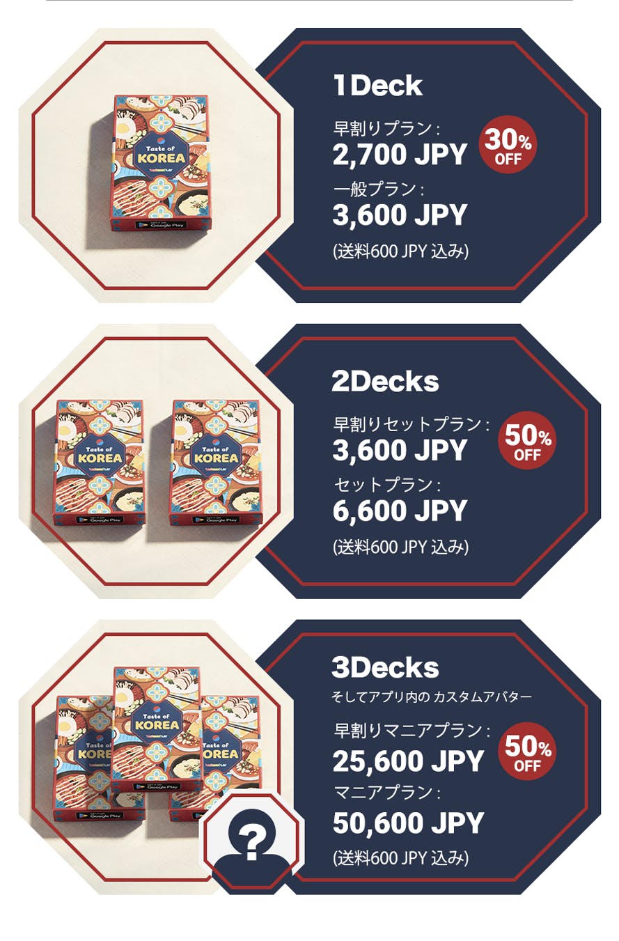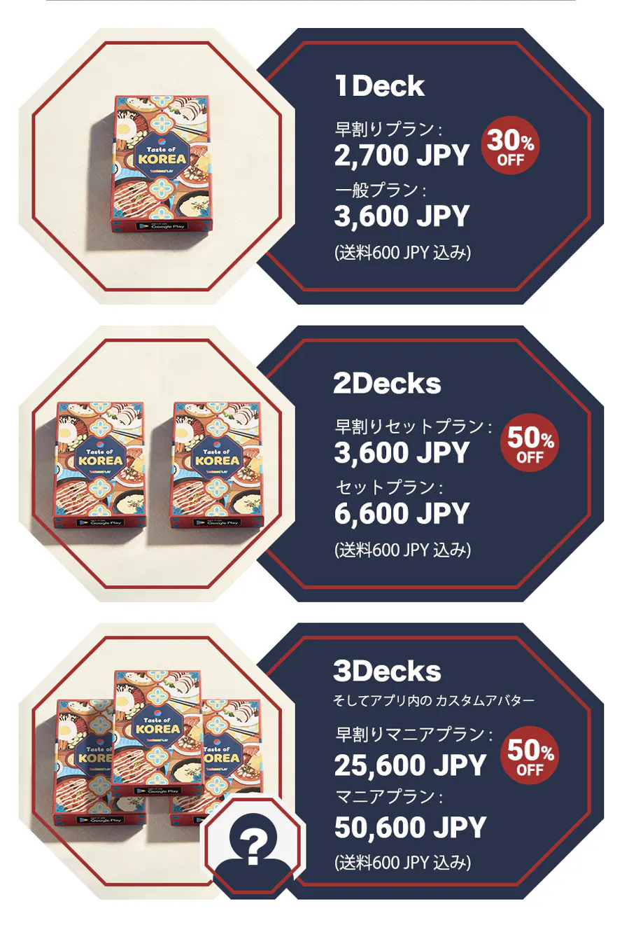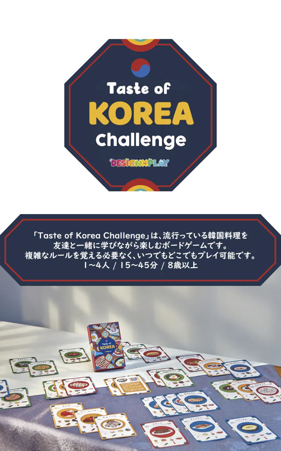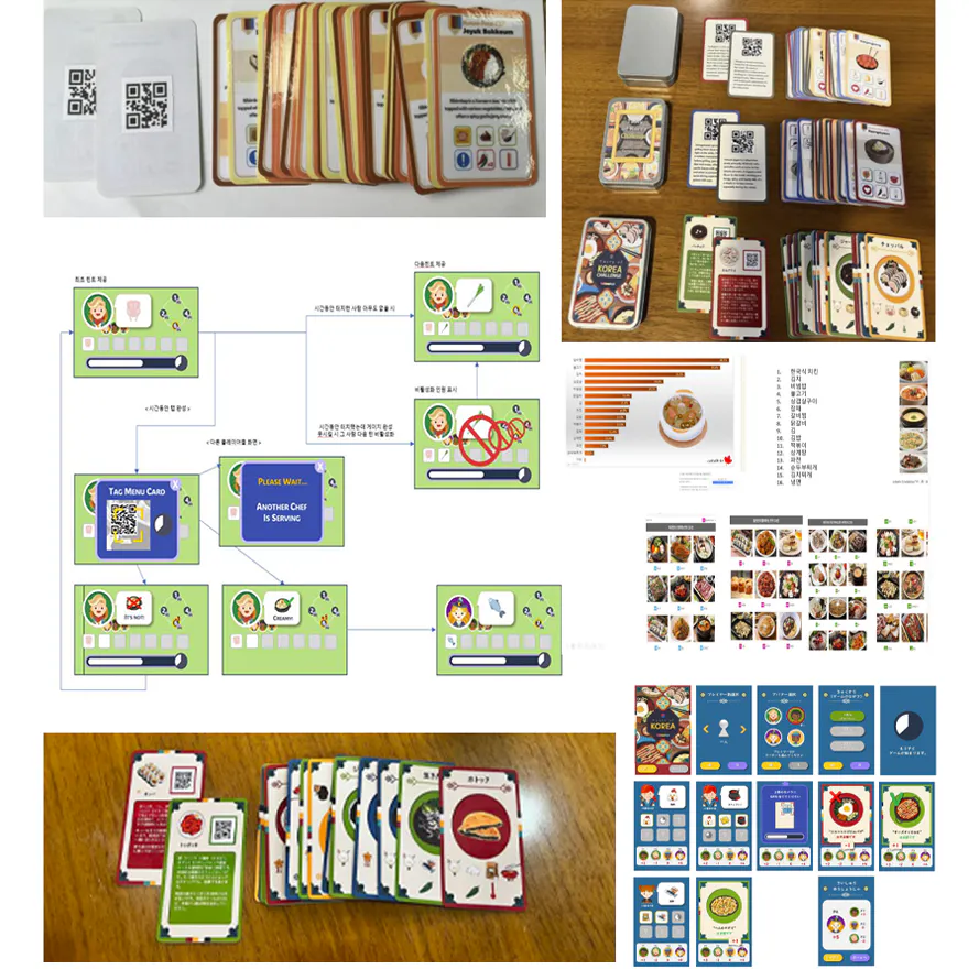DesignxPlayは、ボードゲームを通じて友情を深め、楽しみを共有することを価値とする物理オブジェクトとアプリを組み合わせたゲームコンテンツの制作スタートアップ企業です。私たちは韓国料理をテーマにしたボードゲームをリリースするためにさまざまな試行錯誤の末にたどり着きました。韓国には行きたいけれども、まだ曖昧な方々に、このゲームがさまざまな韓国料理と関連する文化を紹介し、好奇心を引き起こすことを自負しています。急速に変化する韓国旅行のトレンドに合わせて、現在、日本の若者たちが見逃すべきでない最新の韓国料理をまとめました。特に誰もが簡単に楽しめるようにゲームルールをシンプルにし、製品構成を簡素化しました。