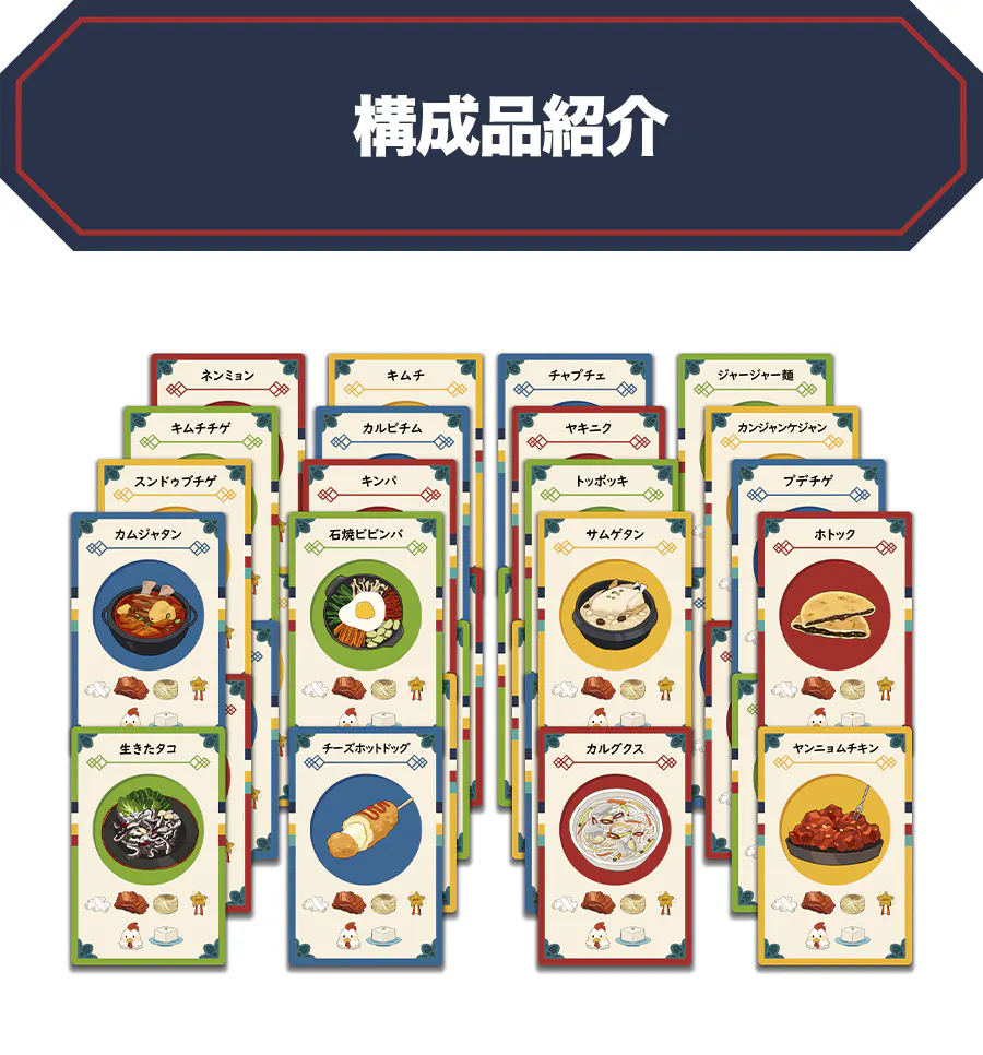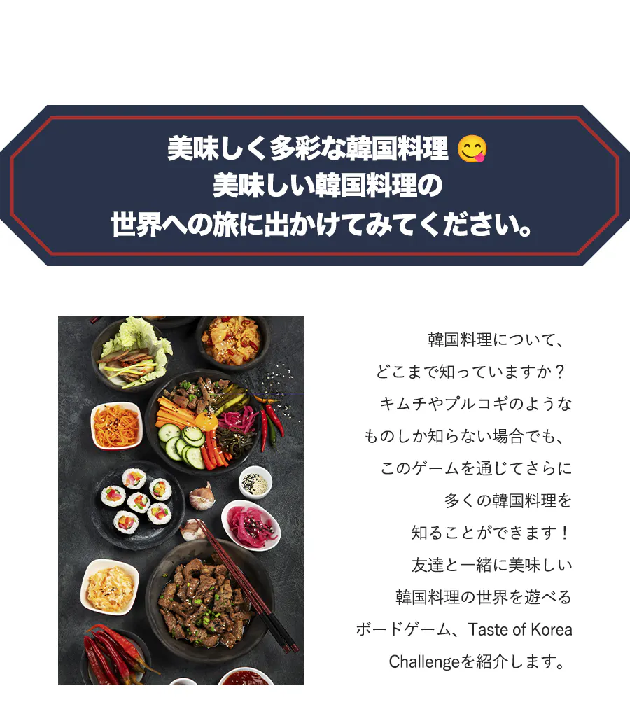 Taste of Korea Challengeは、現在日本で人気の32種類の厳選された韓国料理をテーマにしたボードゲームです。