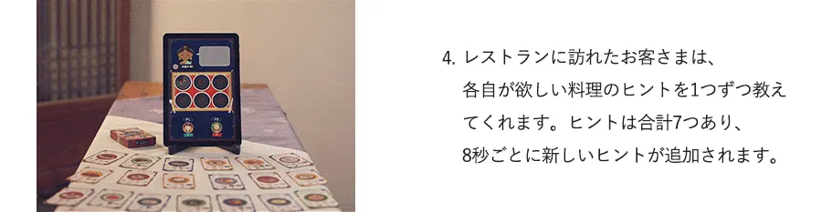 各料理カードには、各料理の写真、紹介、関連するヒントなどが記載されています。
