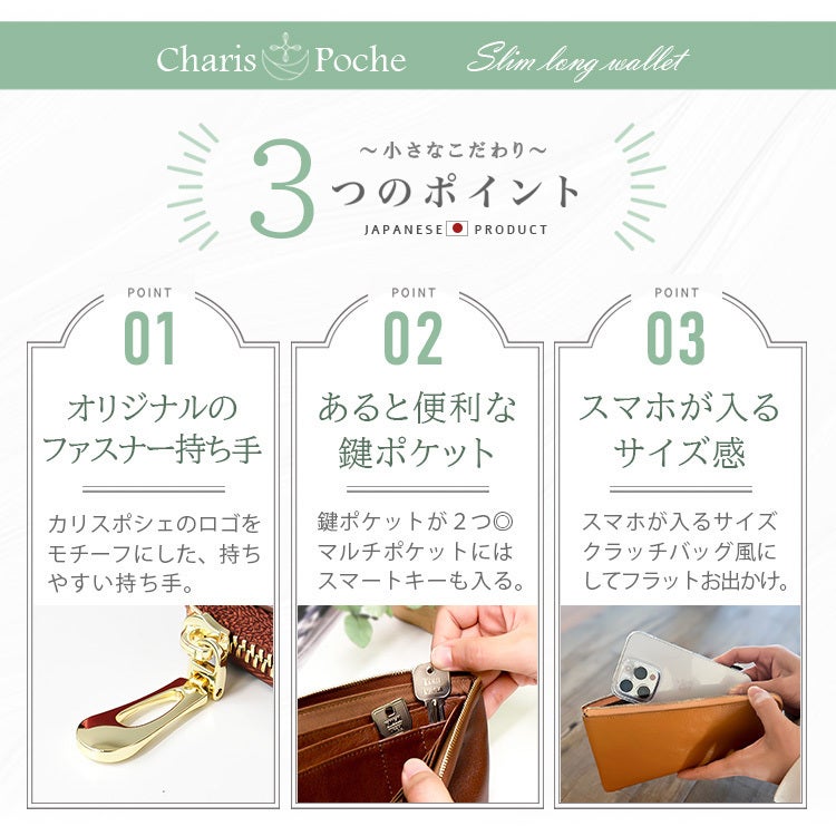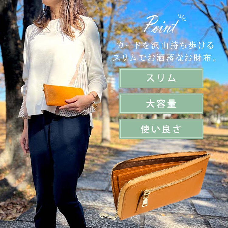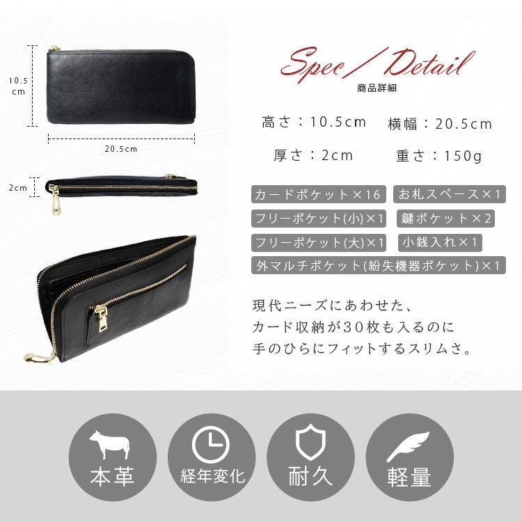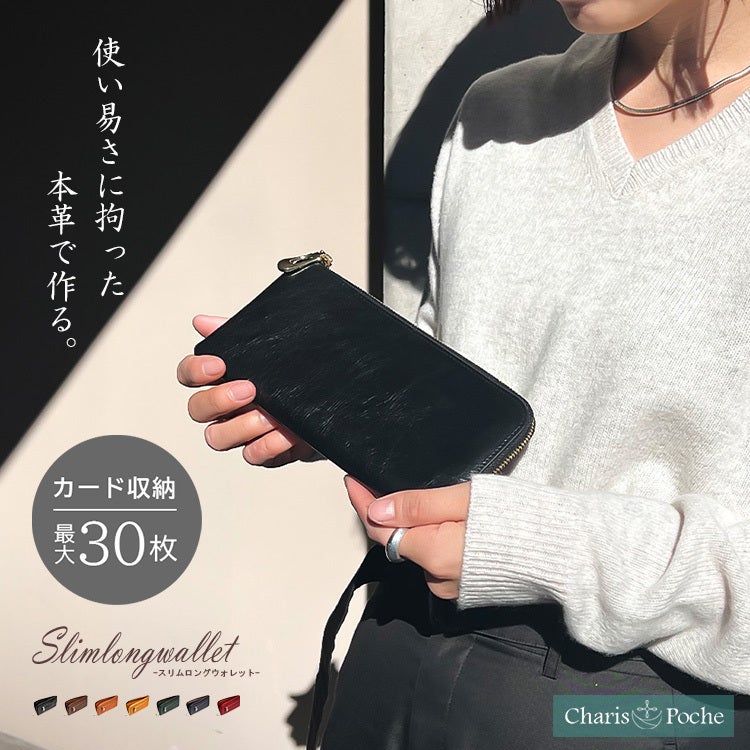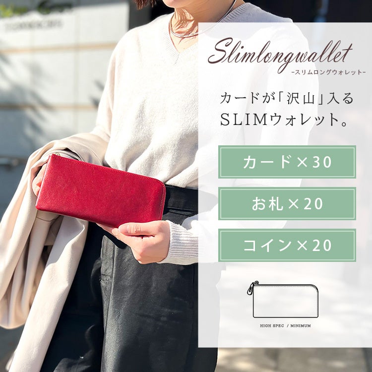 上質なタンニン鞣し革を使用した高級感あふれる「スリムロングウォレット」。現代ニーズにあわせ、カード収納が30枚も入るのに手のひらにフィットするスリムさを実現!ご使用過程で味わいのある変色も楽しめます!