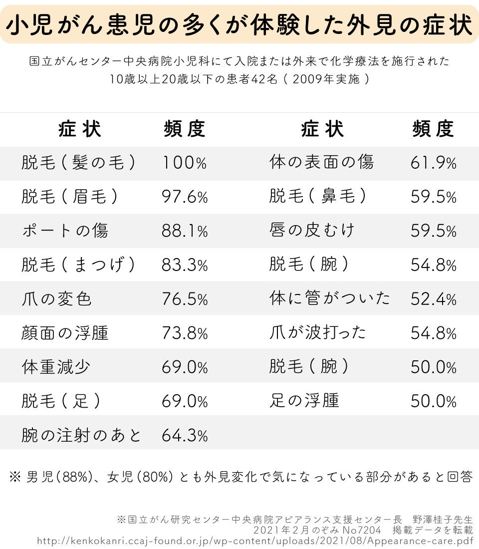 上記の表からもわかるように、小児がん患児の100%が脱毛を経験しています。