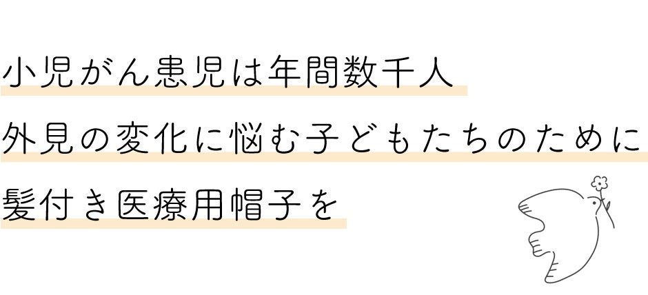 抗がん剤治療による脱毛や、脱毛症の子どもたちは『外見の変化』による不安や戸惑いがあります。お友達との違い、いつもと違う視線に立ち向かえる勇気を届けたいと思い、生み出した商品です。