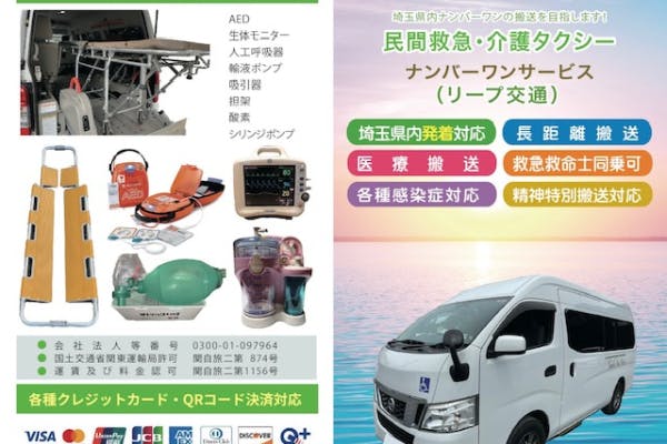 埼玉県川越市と桶川市で介護タクシーと民間救急をやってます株式会社ナンバーワンサービスと申します。現在、乗務員3名、ナース1名、救急救命士2名の計6名で業務しております。