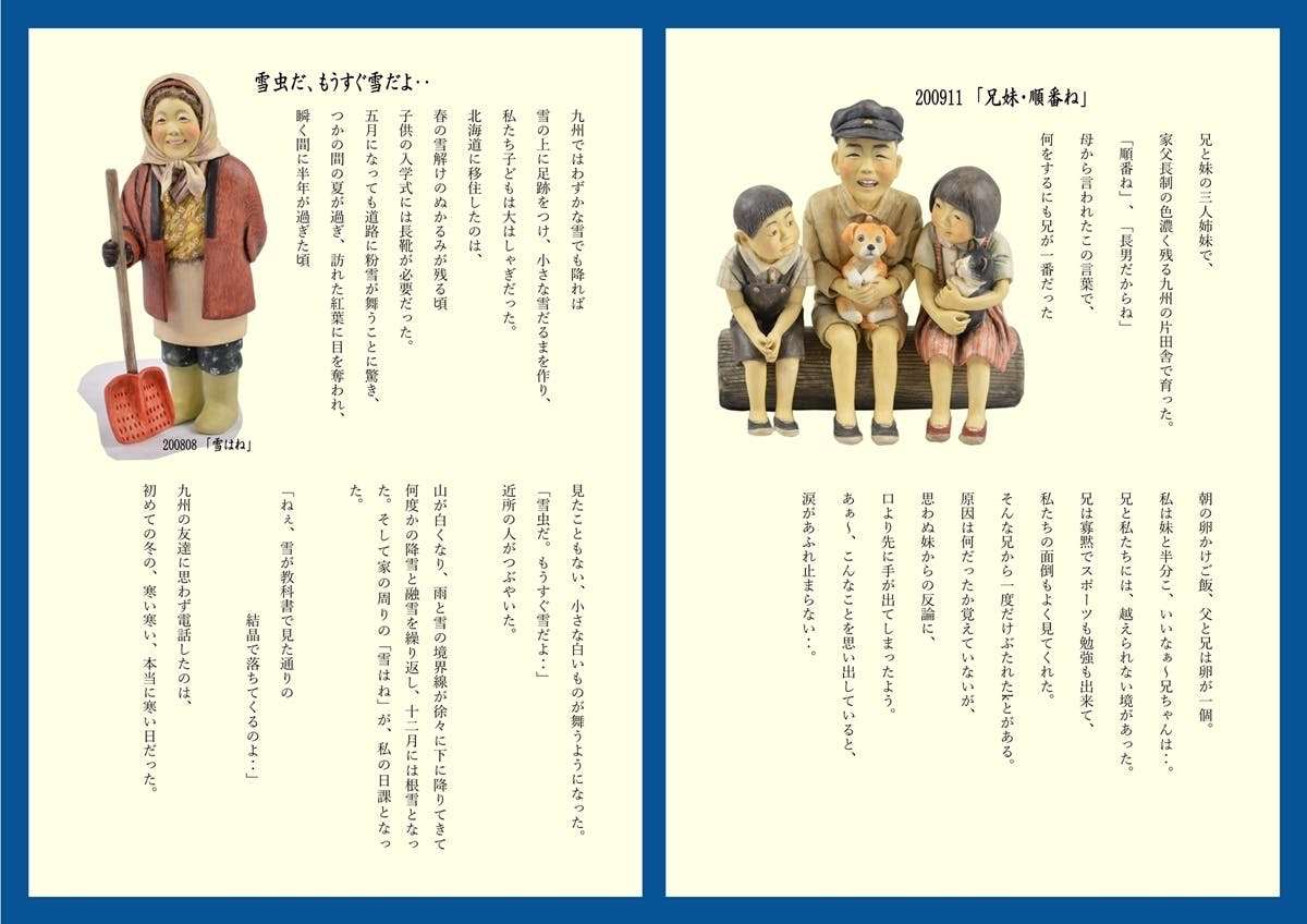 独学の人形作家・宮竹眞澄は、布を使わず粘土と水彩で表現する手法や、ごく普通の人々を題材にし、時には、いじめ、戦争、飢餓、拉致など社会的な側面をもった作品群で、独特の人形の世界を作り出してきました。北海道移住後の2006年に開催された、『道展』に初入選したのを機に自立した人形作家を目指して、『宮竹眞澄・心のふる里人形展』と名付けた全国巡回展を2008年に立ち上げました。