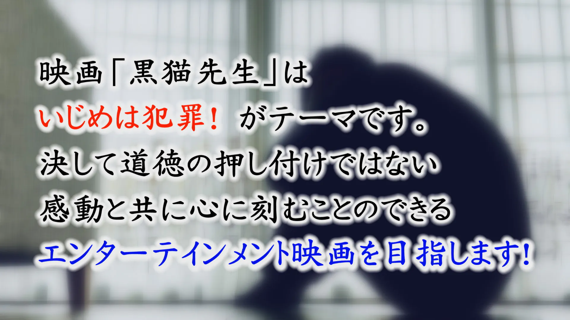 映画「黒猫先生」はいじめ問題という重い題材を扱う映画です。しかし、一人でも多くの方に見ていただくために、映画としての面白さ、楽しさ、感動がなければならないと考えています。最高のエンターテインメントにするため、商業映画で活躍する多くの方々に協力を要請しました。通常、劇映画の製作には1億円以上が必要とされています。本作は一流の出演者・一流のスタッフの協力のもと、1千万円という製作費を算出いたしました。企業様から500万円以上、一般の皆様から500万円以上の援助を想定しています。