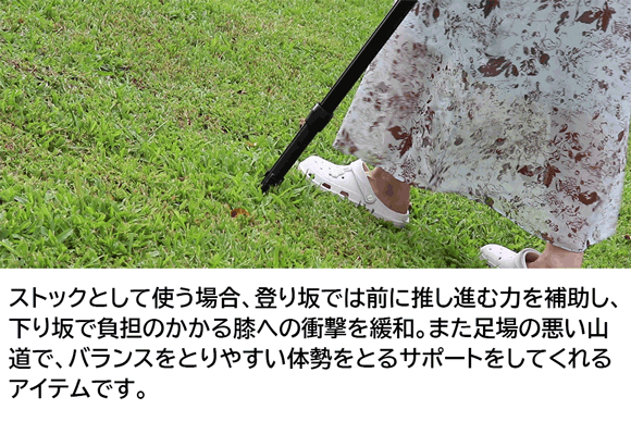 ストックとして使う時、長さは87.5cmから98cmまで伸縮でき、身長に合った長さを自由に調整可能です。