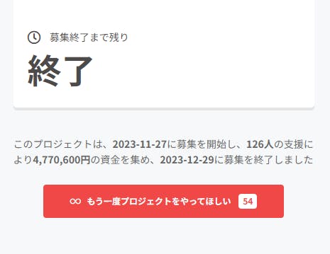 このプロジェクトは、2023/11/27に募集を開始し、 126人の支援により 4,770,600円の資金を集め、 2023/12/29に募集を終了しました