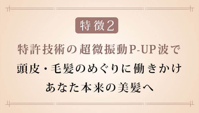 サロンワークでもホームケア用としても使用できる、ヘアケアを本気で考えた逸品です。"すすぎ"の際に使用することで、頭皮頭髪についた汚れ、皮脂、すすぎ残しの余分なシャンプー剤、トリートメント剤を取り除き、シャンプーやトリートメントのポテンシャルを発揮し誰でも簡単に頭皮ケアが叶います。また、P-UP®波の作用で頭皮のめぐりが促され、より効果が高まるため、頭皮環境を健やかに保つことが期待できます。