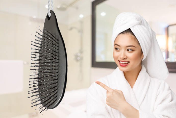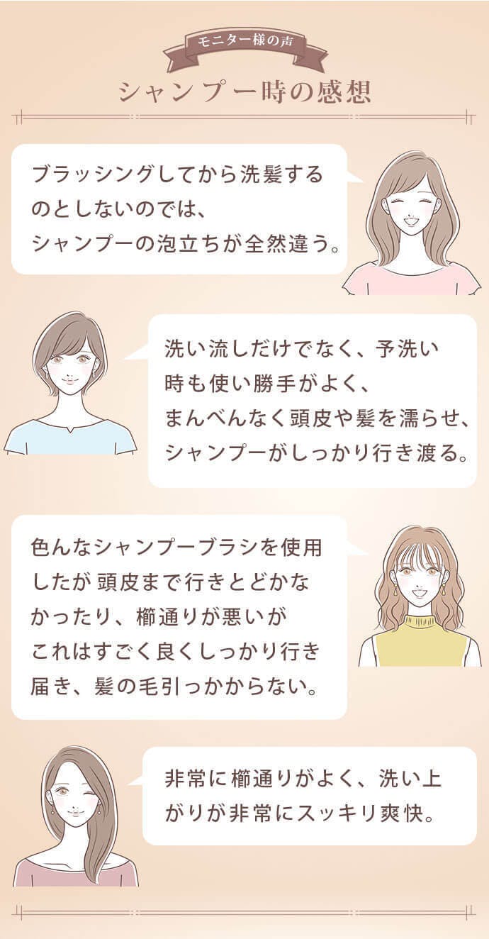 A:シャンプー前に、軽くブラッシングして、毛先のもつれをほぐします。頭皮や髪を丁寧にすすぎながら、ブラッシングを前から後ろ、後ろから前と縦方向に使いながら汚れを洗い流します。