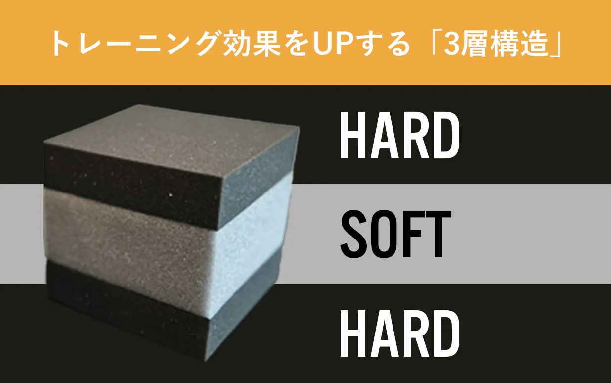 コアスクイーズサーフェスは硬い、柔らかい、硬い、の3層で構成されます。ウレタンの硬度、厚み、大きさを何度も試作を重ねて理想を追求しました。