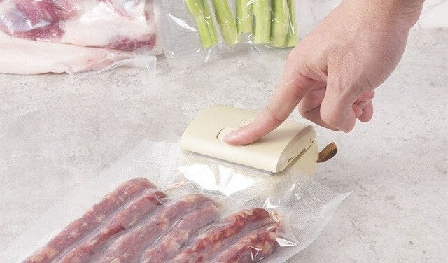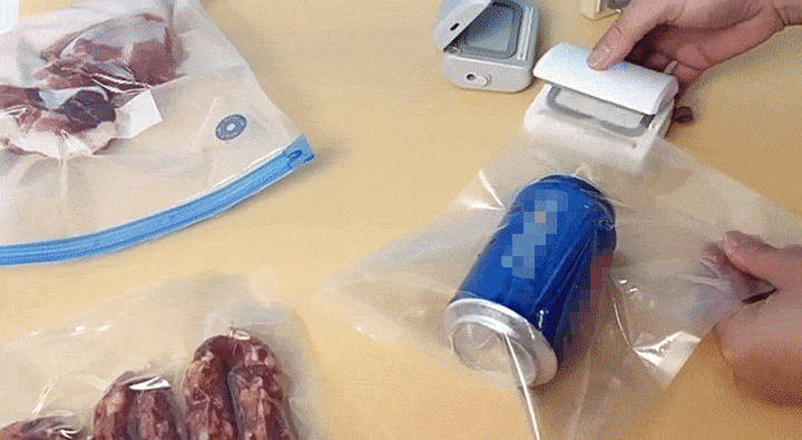 真空パックする時に専用袋は必要なし、本体を押すだけで様々な食材を真空パックできます。-60kPaの強力吸引力で袋の中の余分な空気を吸い出します。4in1真空パック・カッター付き・空気抜き・空気入れ、あらゆるシーンで対応ができます。