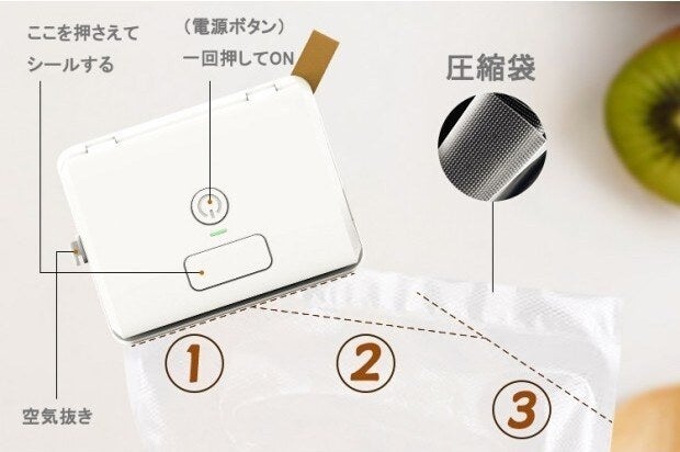 ※吸引溝に袋をセット⇒電源ボタン押す⇒シールボタン(1-2秒)⇒空気抜きゴム押す