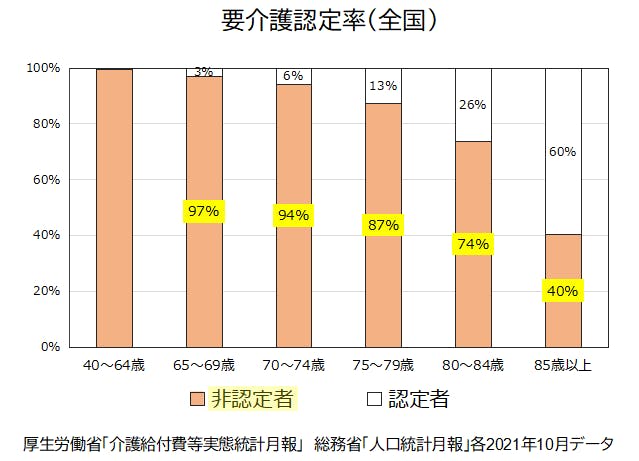 全国の要介護認定率は上のグラフに表示しましたが、80~84歳でも74%の方が非認定者であり、たまに子供に来てもらいながらも、普段は自分で頑張って生活されています。