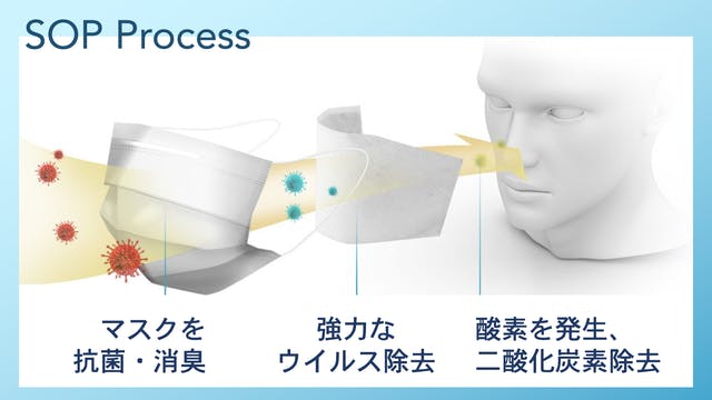 マスクの内部に固体酸素シートを貼ることで、ウイルスなどの微生物を除去し、酸素を発生させると同時に二酸化炭素を分解除去します。
