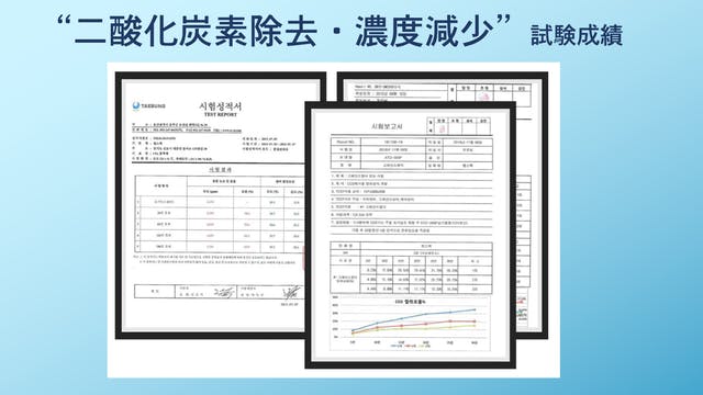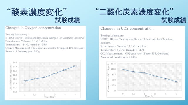 固体酸素シートの試験成績で、酸素の濃度が増加し、二酸化炭素の濃度が減少することが分かりました。