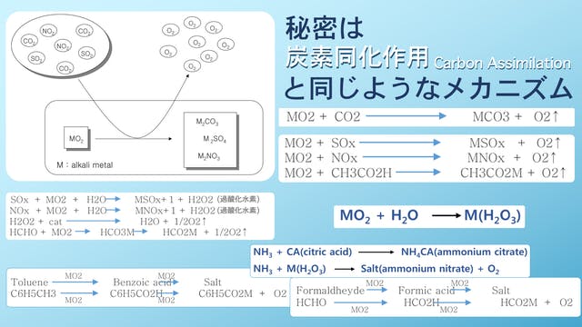 固体酸素シートは、炭素同化作用(※)のようなメカニズムにより、ウイルス、バクテリアなどの微生物はもちろん、ホルムアルデヒド、アンモニア、VOCsなどの様々な有害物質を除去することができます。