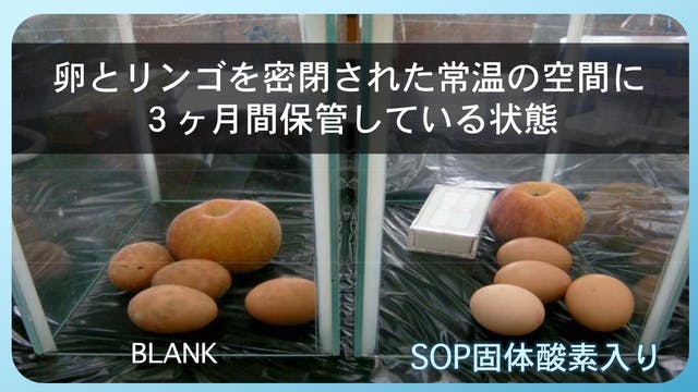 密閉された空間に固体酸素を一緒に入れることで、リンゴと卵が腐敗せず、強力な除菌・抗菌・微生物および有害物質除去能力が分かりました。