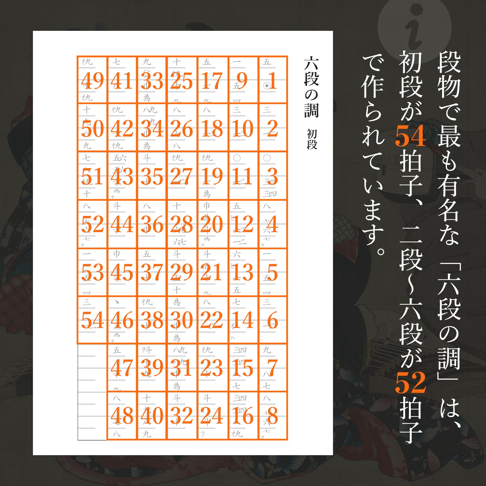 段物は、「段」と呼ばれるいくつかのセクション(西洋音楽でいう楽章)から成り立っており、各段が「52拍子」(たまに54拍子)と、フォーマットが厳密に定められています。