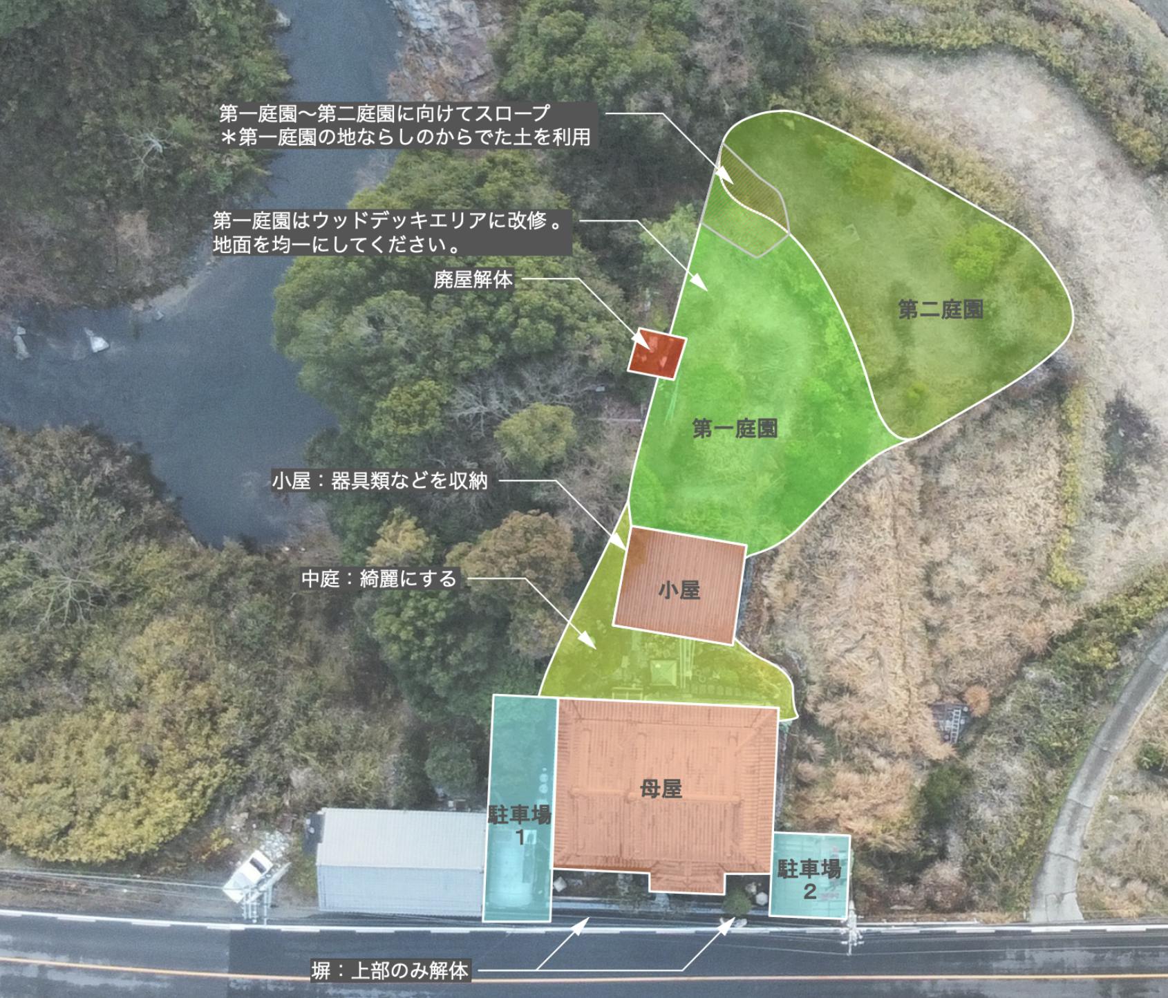 古民家抹茶カフェ建設候補地を上空からドローンで撮影した写真や、古民家周辺の完成予想図がこちらです。