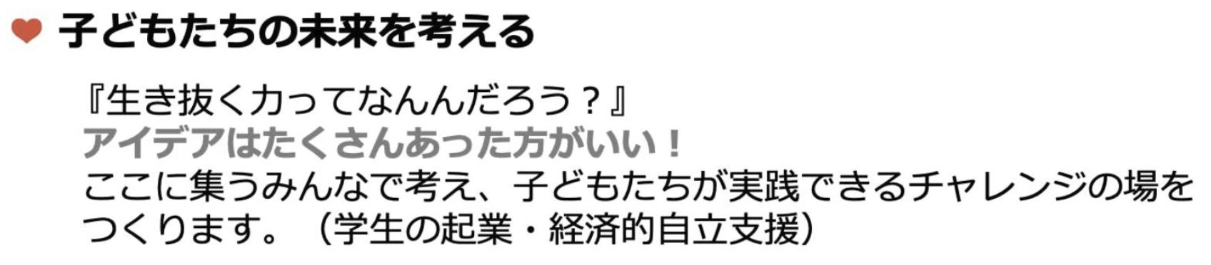 明るい日本の未来をイメージし、無限の可能性を持った子ども達を真ん中に地域とつながり「生き抜く力」を育む子育て拠点づくりの伴走者としてアシストして頂けると有難く・心強く思います。どうぞよろしくお願い致します。