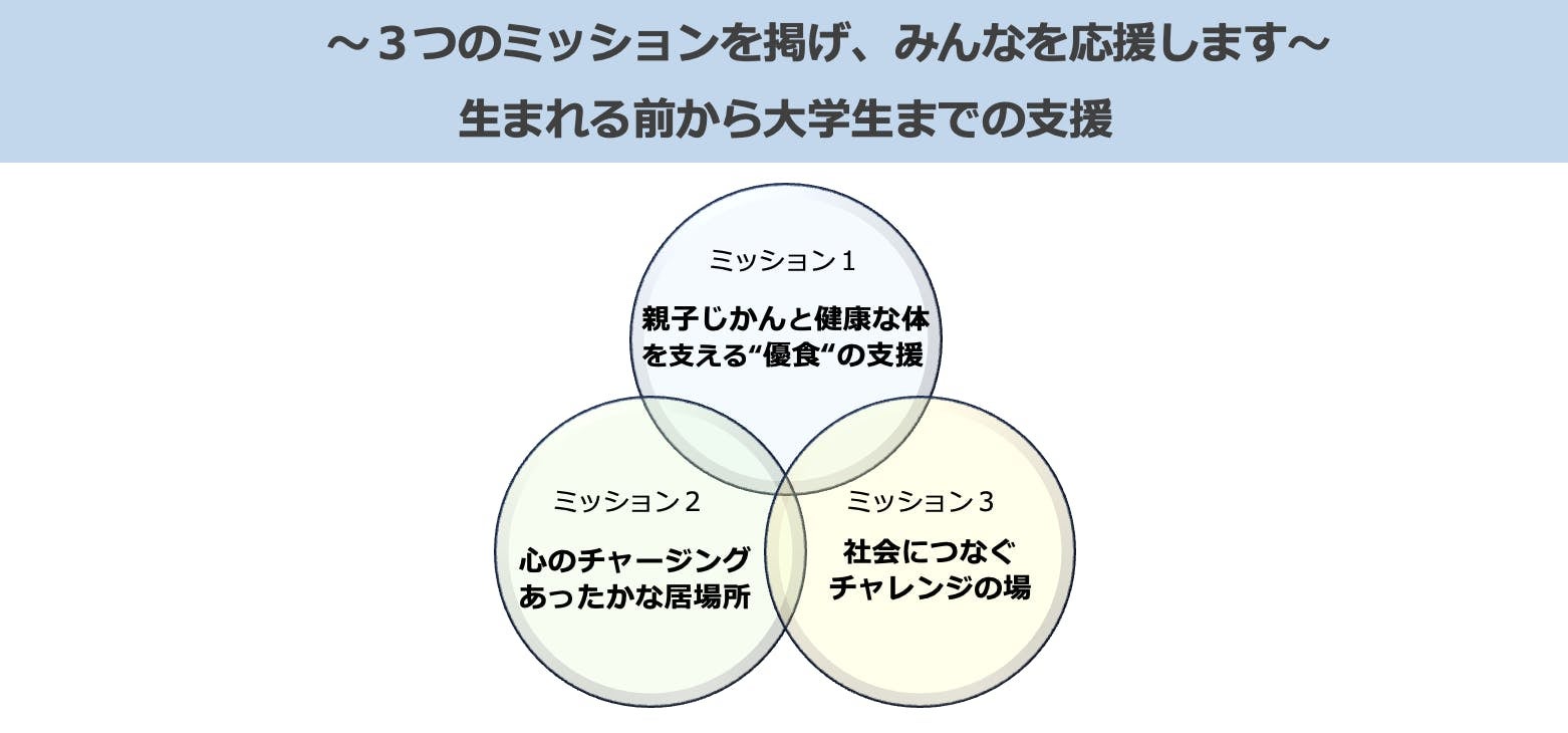 「食」「居場所」「チャレンジの場」の3つの要素があります。食の問題、居場所の問題、そして子どもたちが社会に出るまでのサポートの3つを軸に、地域の人たちといっしょにこの社会課題を解決していきます。生まれる前から大学生までをみんなで応援し、だれでも利用出来る場所です。