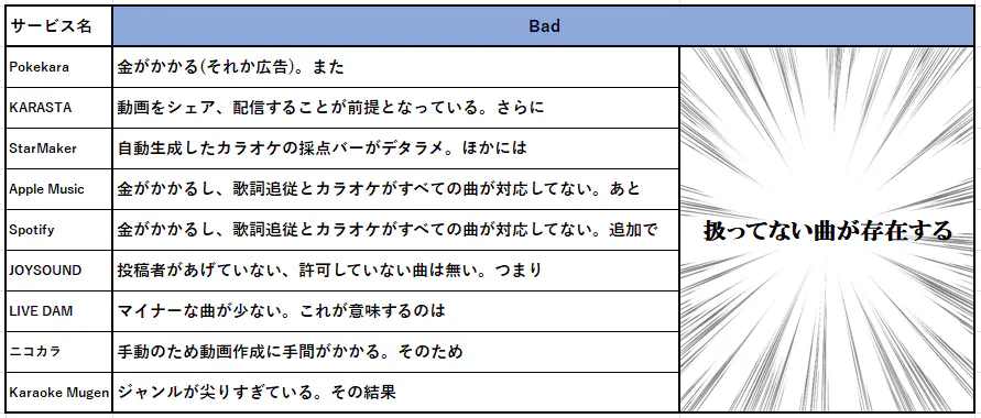 満足のいくサービスはありませんでした。いまあるカラオケサービスは「個々の好きな曲」をカバーできないんですね。時代遅れだなぁ(´・ω・`)