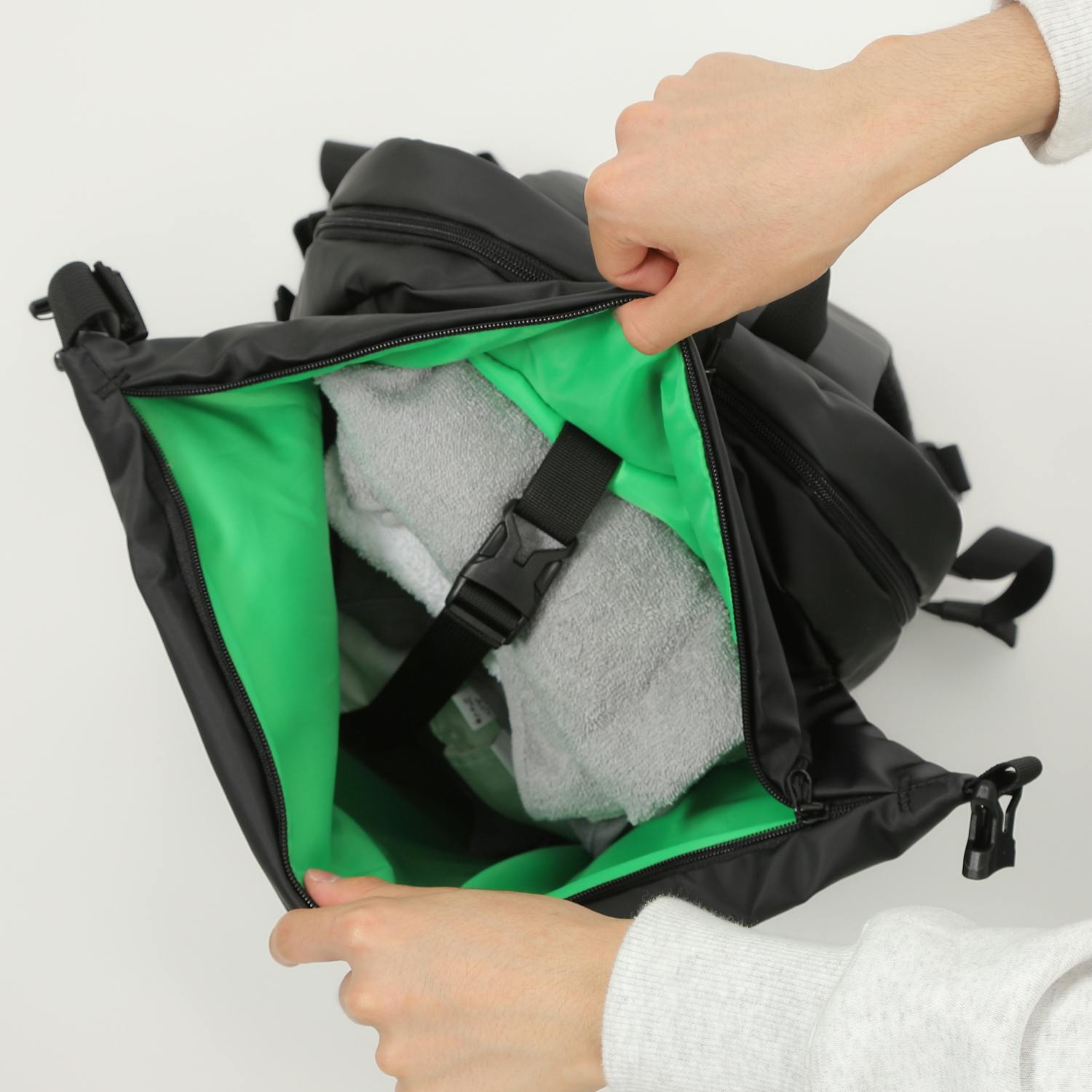 PC収納スペースとメイン収納スペースはそれぞれたっぷり10Lのキャパシティで靴や洋服などもたっぷり収納できるので、仕事帰りにジムに行ったりする場合にも使えます。
