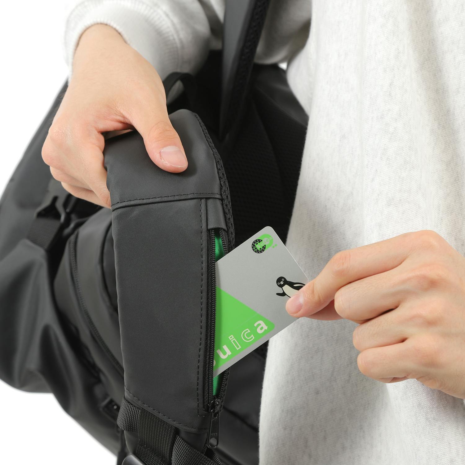 バッグを背負っているときでもスマートにカードを取り出せるように、ショルダーベルト左右にポケットを作りました。電車やバス乗車時にはすぐに取り出せるので特に効力を発揮するので、とっても便利です。