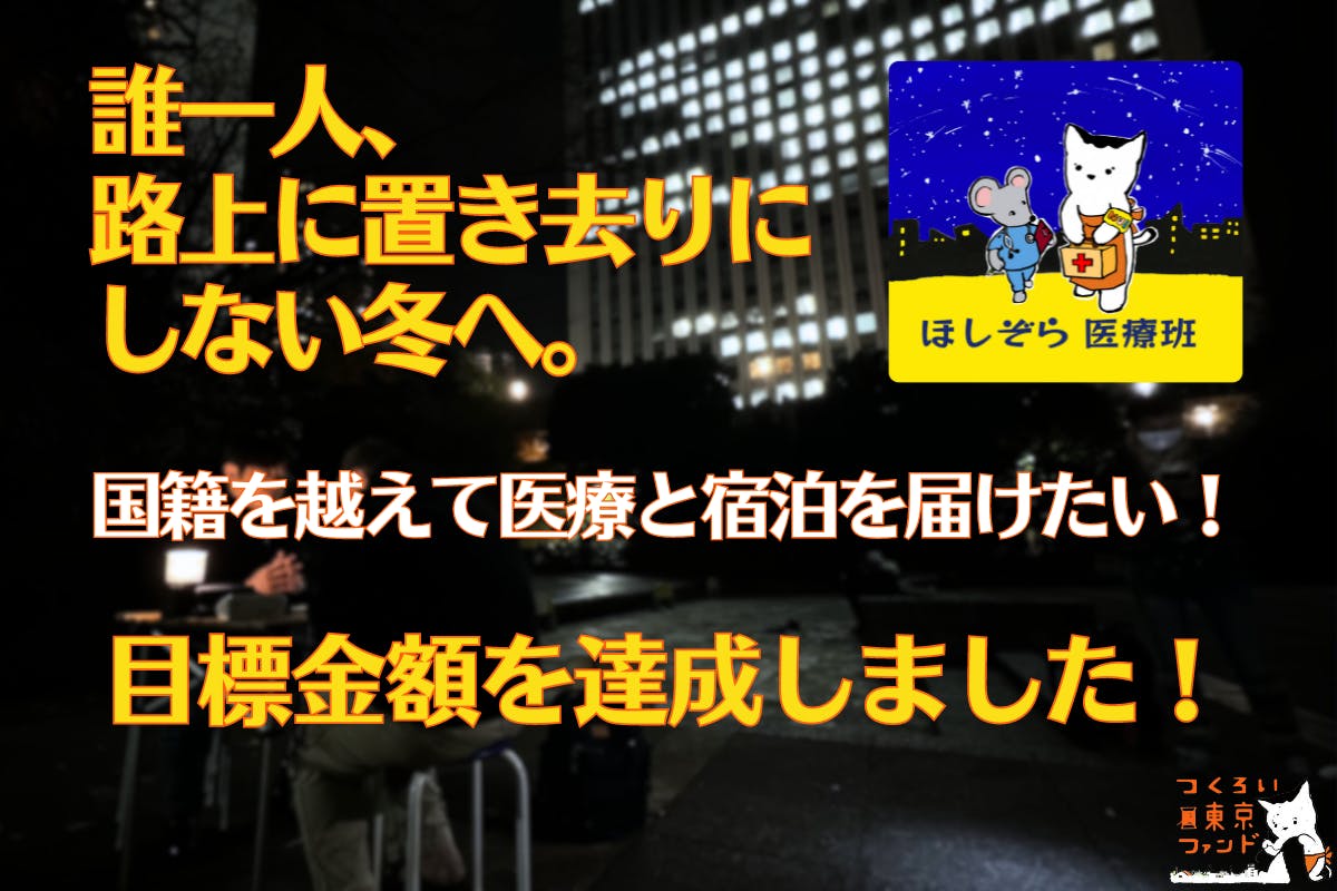 昨年末から開始した、こちらのクラウドファンディング「誰一人、路上に置き去りにしない冬へ。国籍を越えて医療と宿泊を届けたい!」ですが、最終日である2月29日、目標金額としていた500万円を達成いたしました!