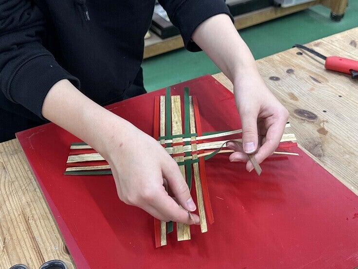 「ウルシの木の黄色を活かせるアイテムを考えました。ウルシの木は無着色です。他の木の色との違いも楽しんでいただけたら嬉しいです。ウルシの木はスギやヒノキに比べて、割れやすかったり、裂けやすかったりするため、シート材製作の際には、慎重に扱うのが大変でした。2枚のシート材の間にボンドを塗り、薄い和紙を挟んでアイロンをかけて伸ばしながら貼り合わせました。編み込むときにシート材が裂けたり剥がれたりしないようにボンドをむらなく塗ったり、アイロンをかけるときに気泡が入らないように気を付けるなど、きれいで質の良いシート材を作るのが大変でしたが、丁寧な作業を心掛けました。玄関やリビングの壁に飾ってインテリアとして使っていただきたいです。」(手塚さくら)