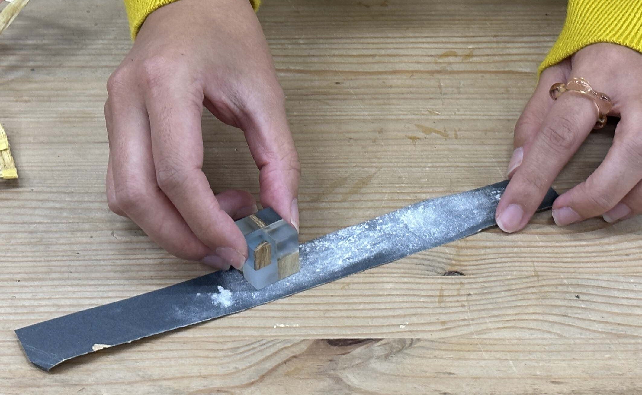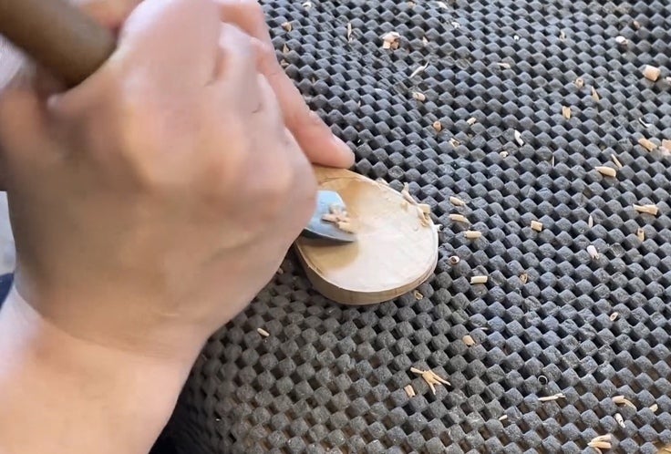 「ウルシの木は柔らかい部分と固い部分の差が大きいなど、他の木との違いが大きく理想的な形の削り出しに毎回苦労します。それでもこの独特な柔らかい手触りと、優しい黄色はとても魅力的で、木材としても活かしてあげたいと思い、機械で荒型を取った後は、手でひとつずつ削っています。」